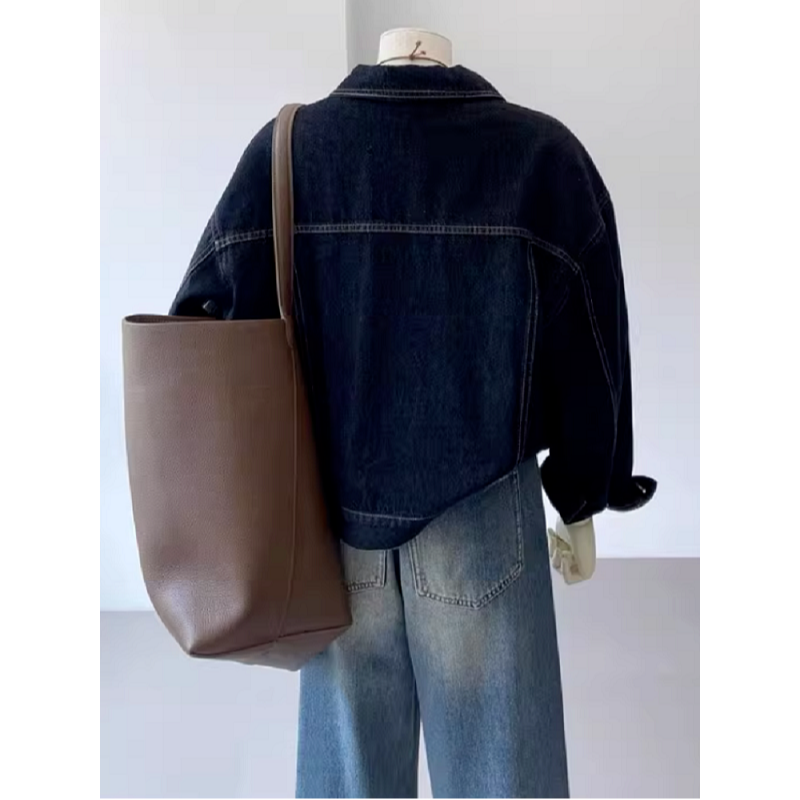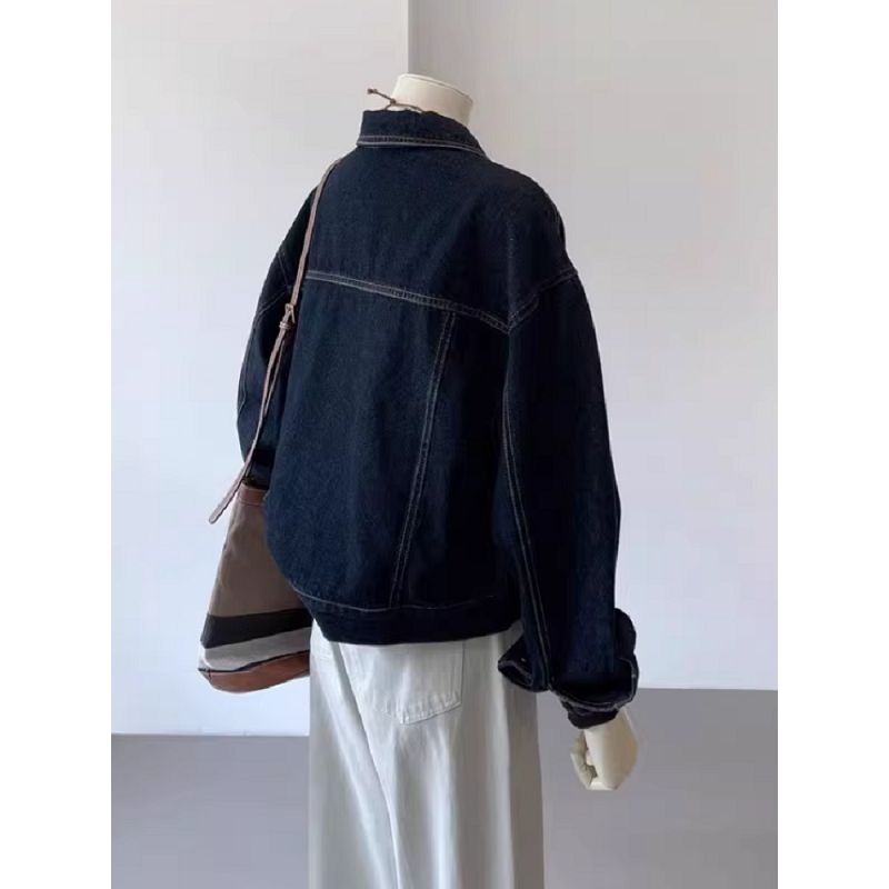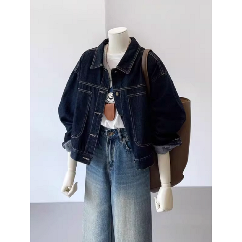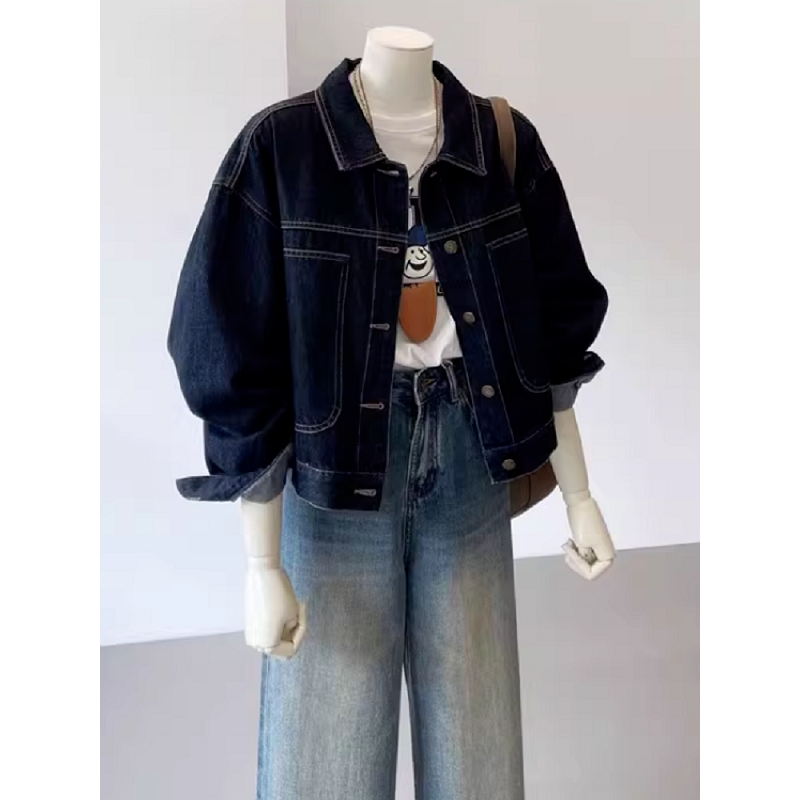 深蓝色复古工装牛仔外套女春秋休闲口袋设计感小个子短款上衣夹克