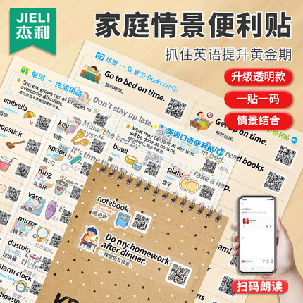 小学生家庭情景英语口语贴纸升级防水透明随处便利贴儿童启蒙英语单词励志短语短句日常生活学习贴纸扫码音频