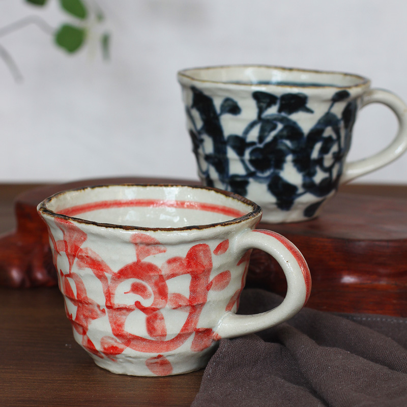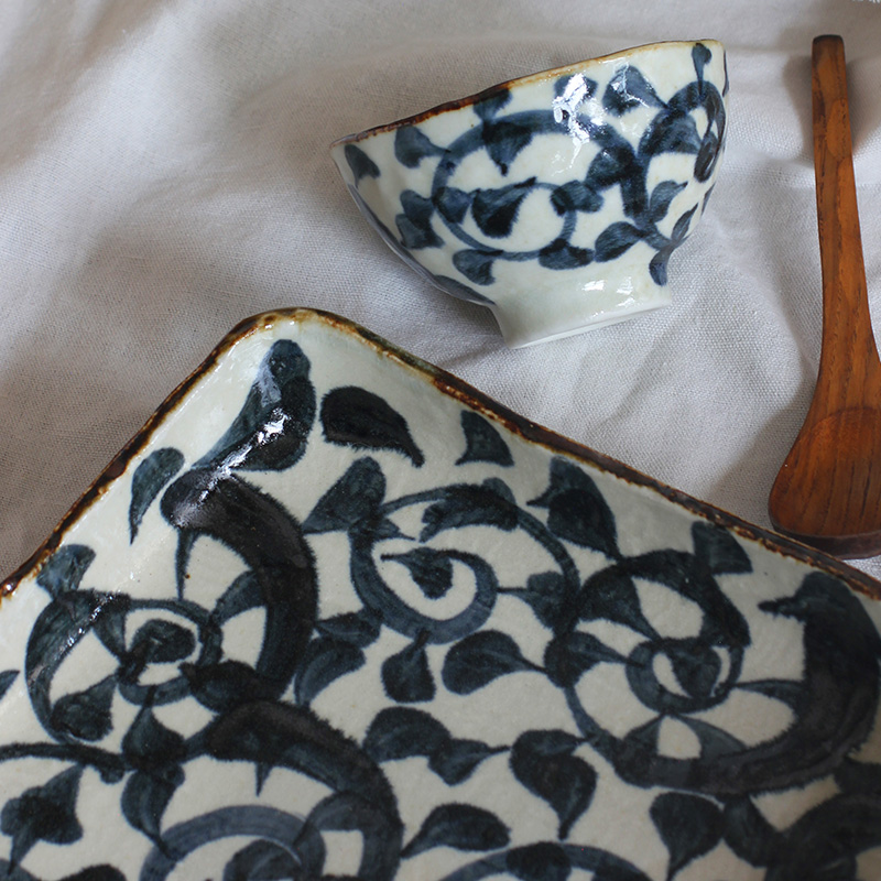 日本美浓烧进口家用章鱼唐草纹复古和风手工餐具窑变釉碗盘手绘碗