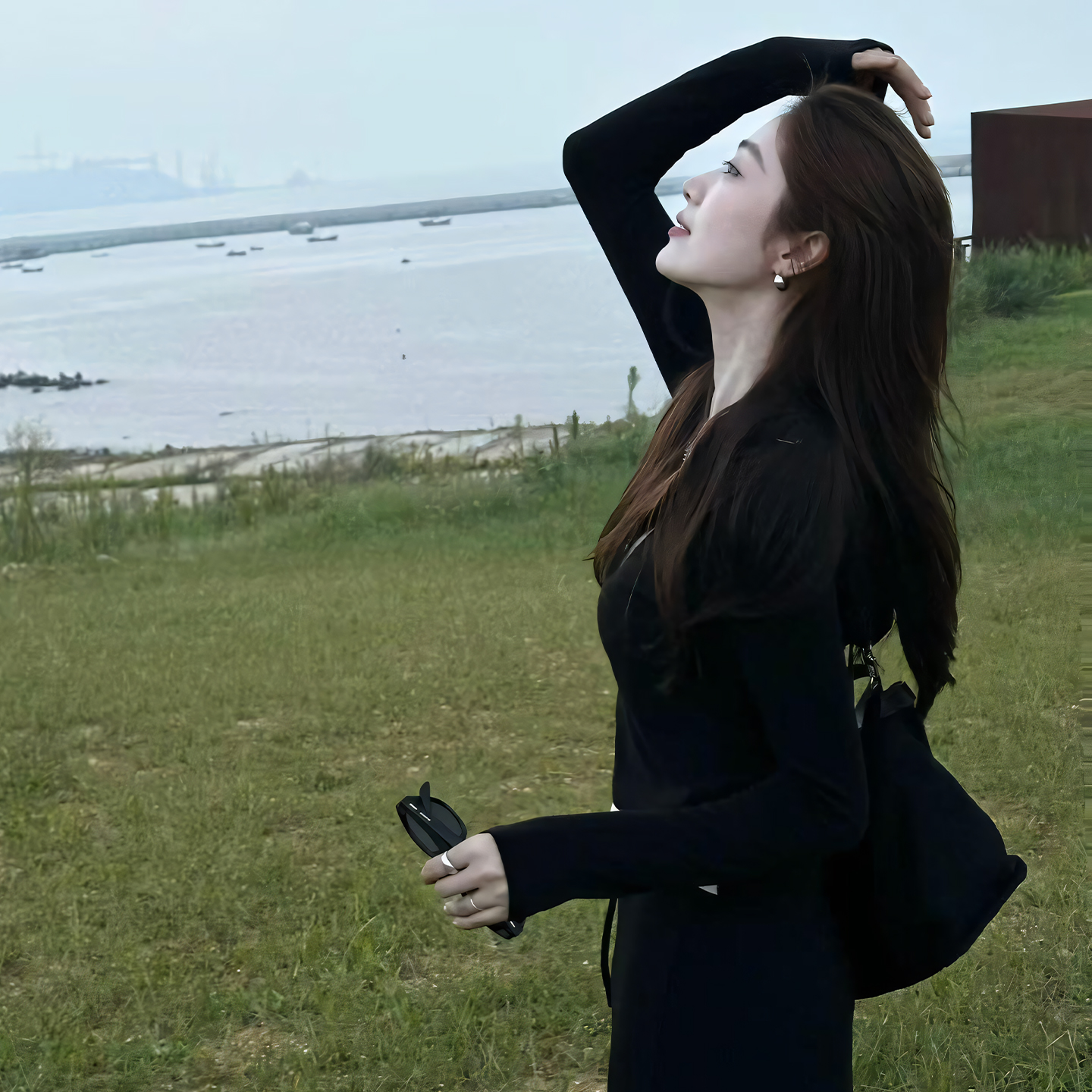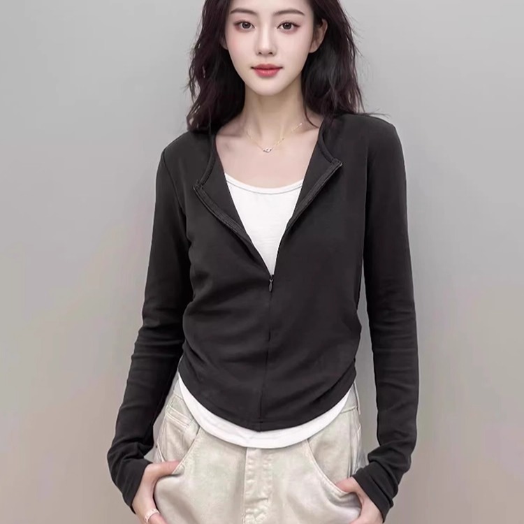 黑色假两件v领长袖针织衫女秋季修身显瘦韩系内搭单穿打底衫上衣