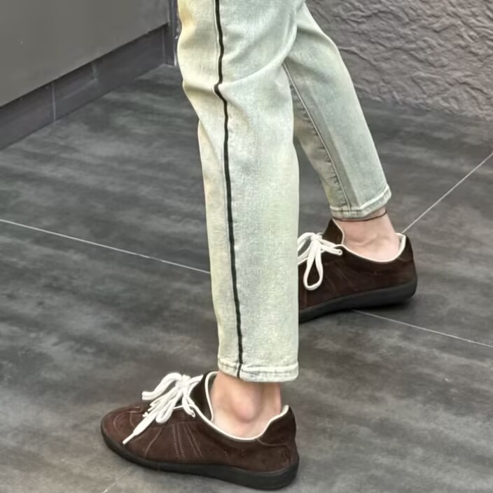 设计款条纹印花牛仔裤男修身小脚2025春夏季新款复古浅蓝色九分裤