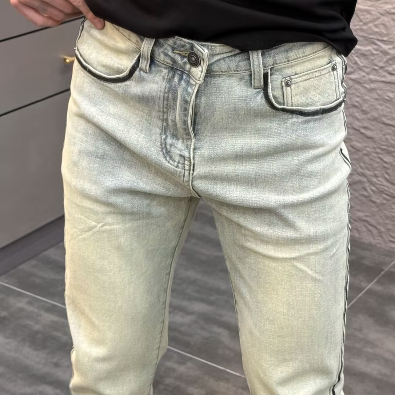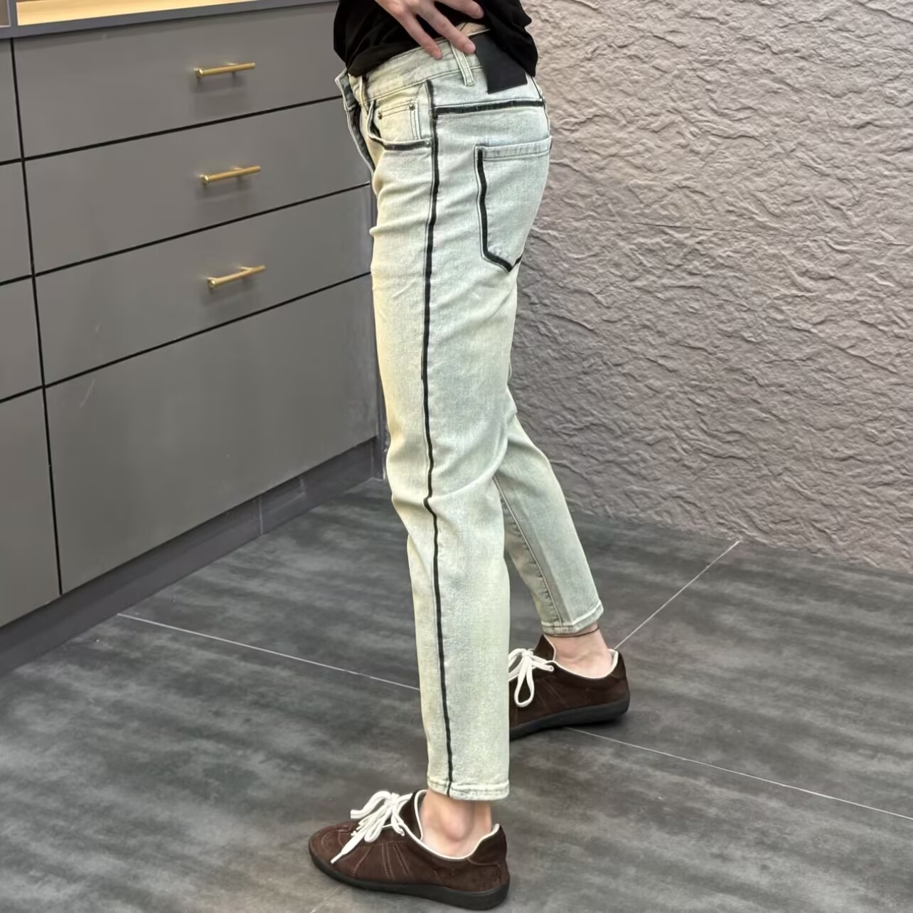 设计款条纹印花牛仔裤男修身小脚