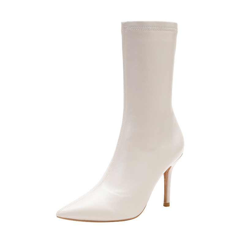 白色短靴女细跟单靴2025冬款加绒尖头高跟靴裸靴中跟马丁瘦瘦靴