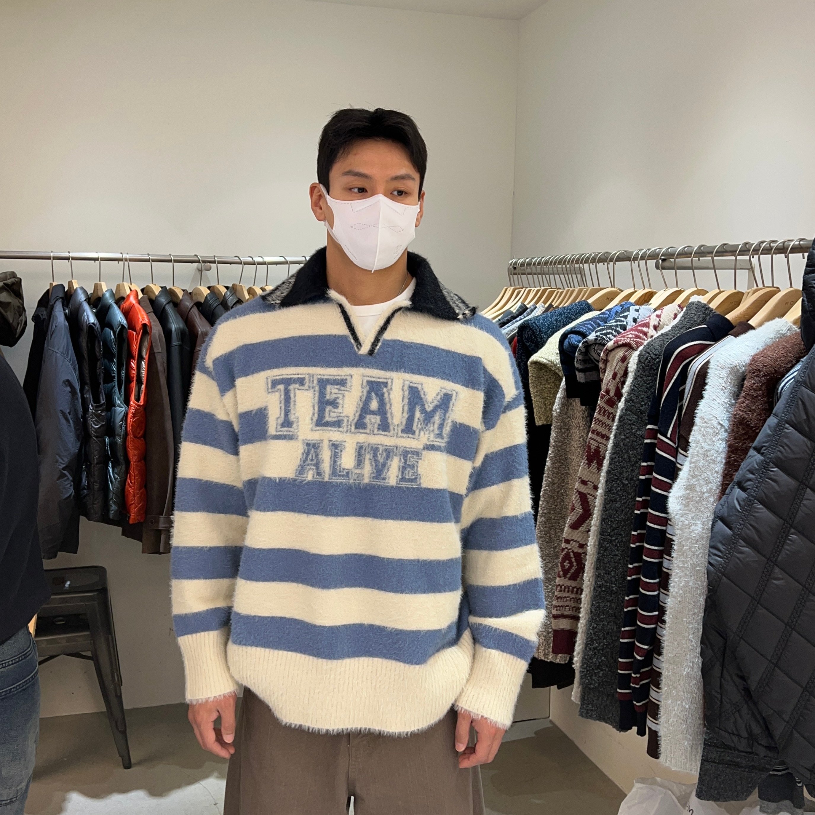 韩国男装代购直播ALIVE翻领条纹学院风毛绒绒阔版落肩针织衫毛衣