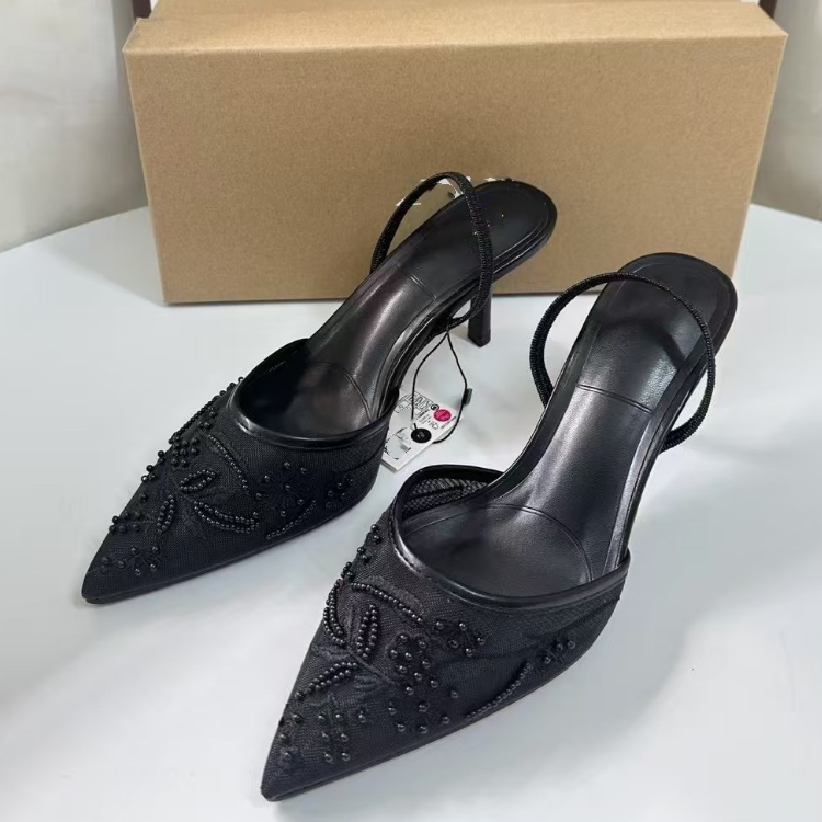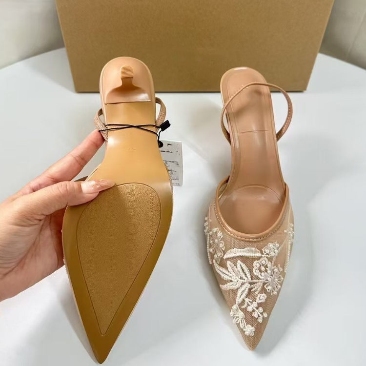 西班牙2025春季新品气质尖头刺绣网面高跟鞋细跟后绊带露跟女凉鞋