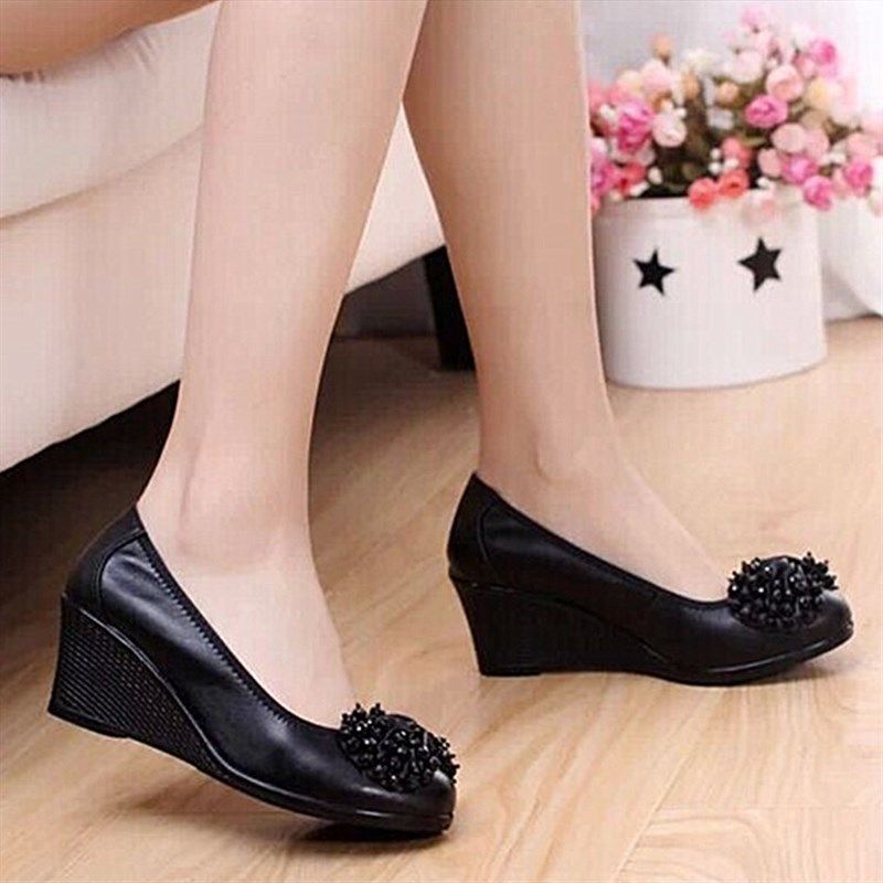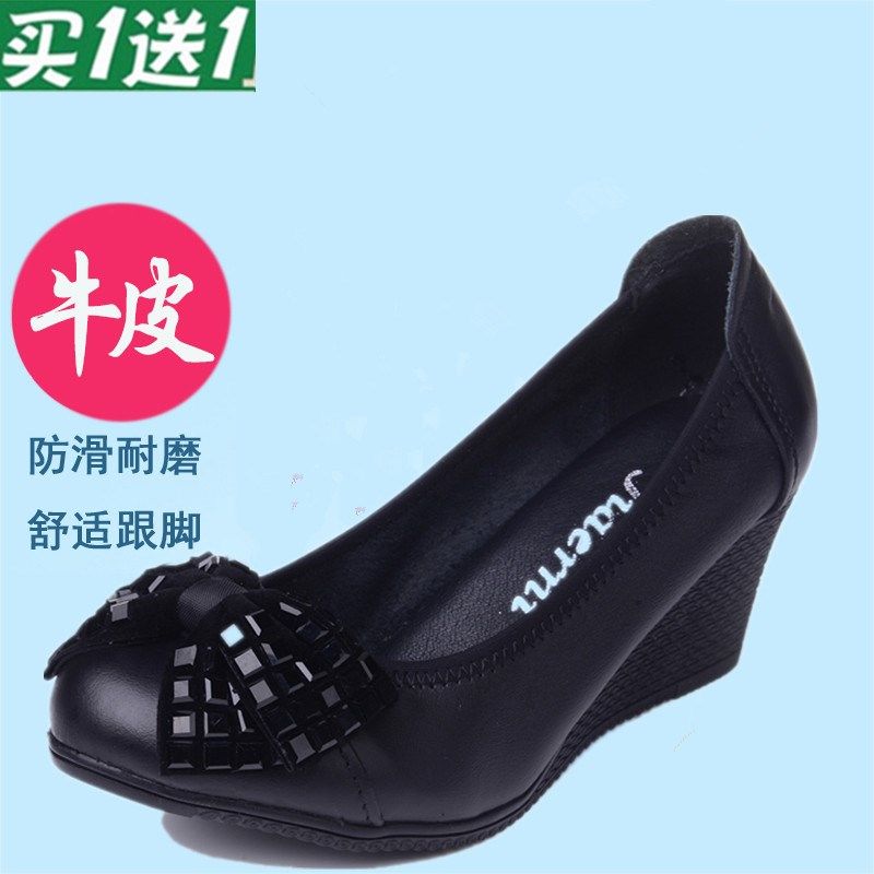 2025春秋妈妈鞋子真皮软底坡跟中跟中老年皮鞋舒适浅口防滑女单鞋
