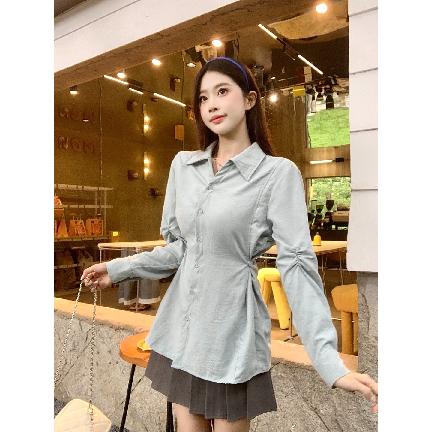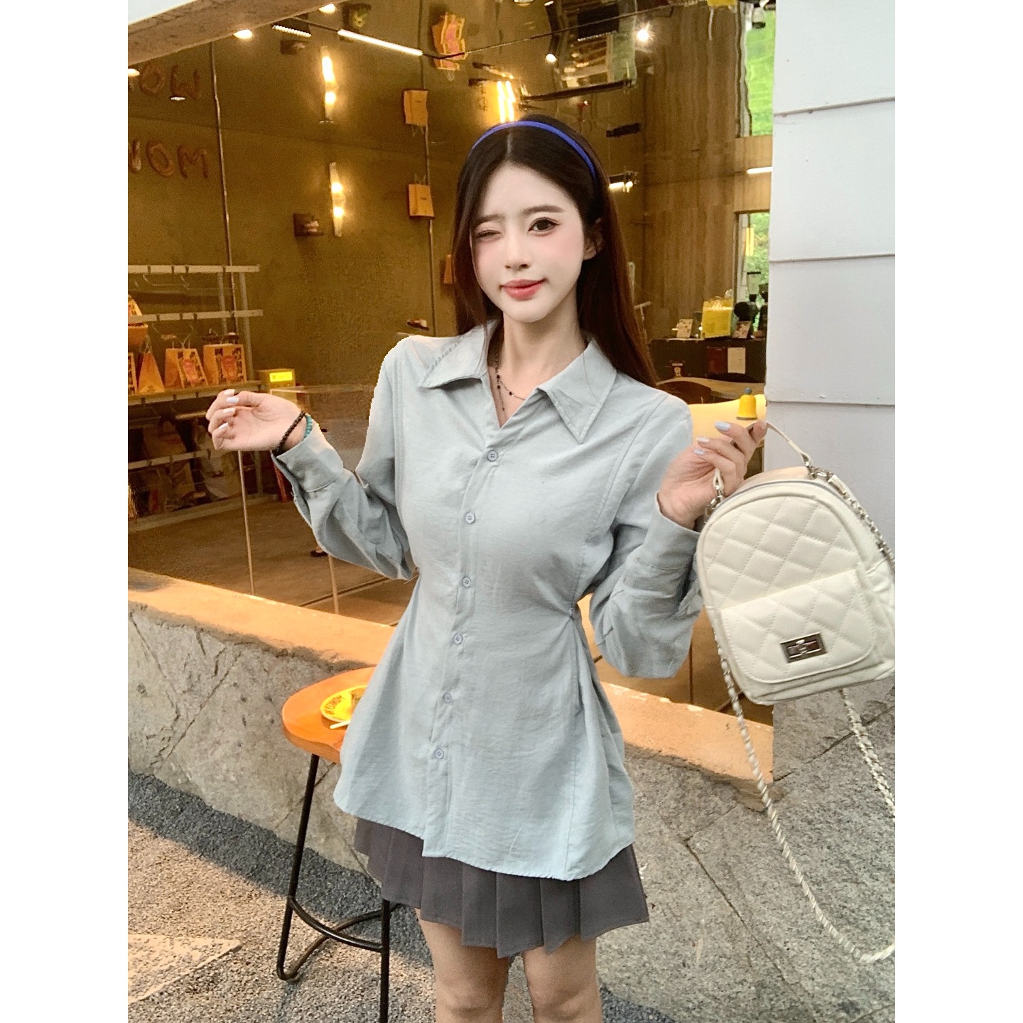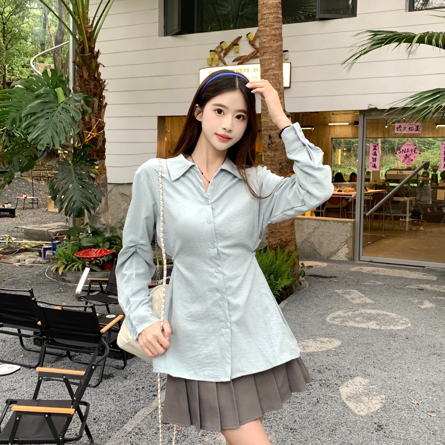 大码胖mm韩系穿搭POLO领长袖衬衫女春新款收腰显瘦中长款排扣上衣