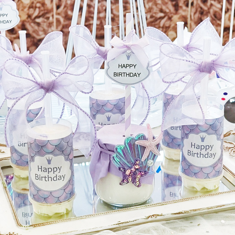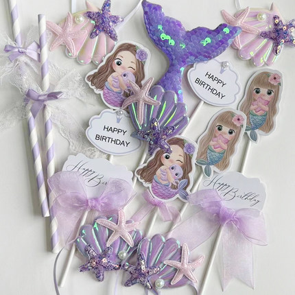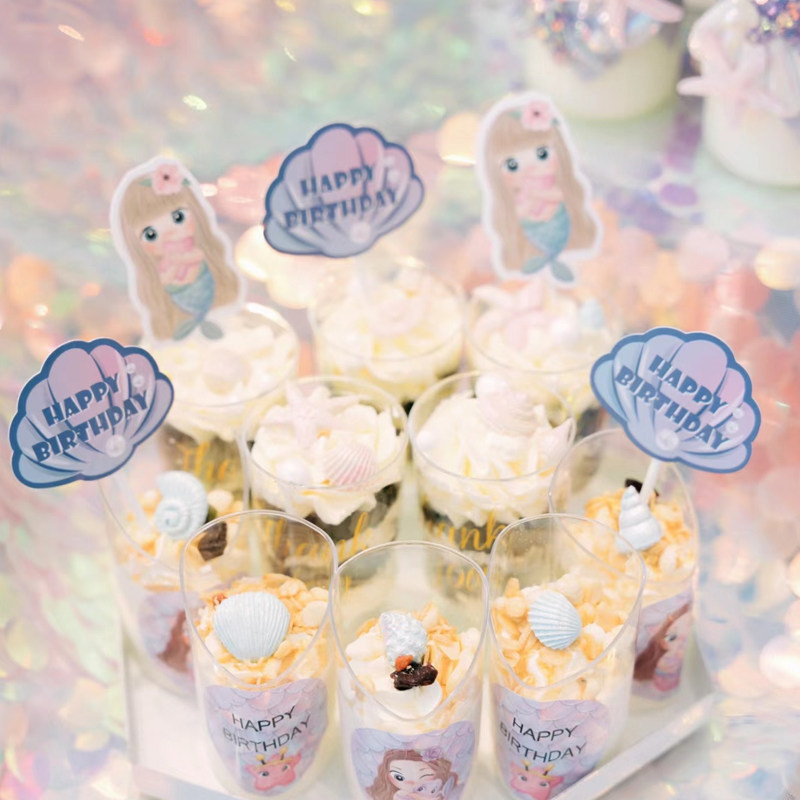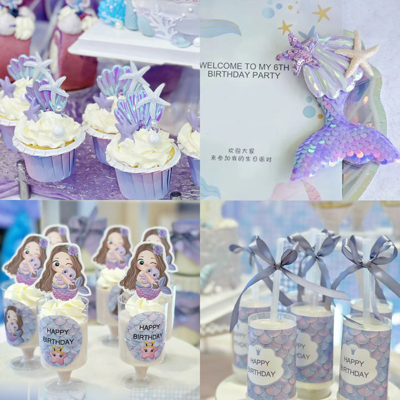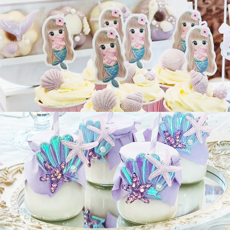 人鱼公主甜品台 美人鱼生日 贝壳布丁绑带 蛋糕插件装饰