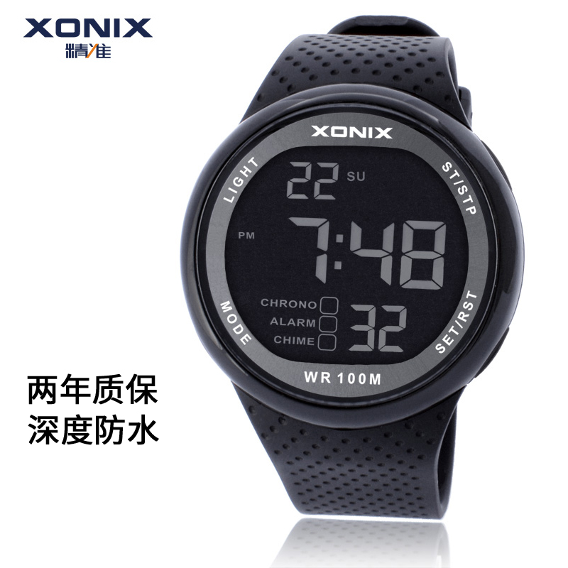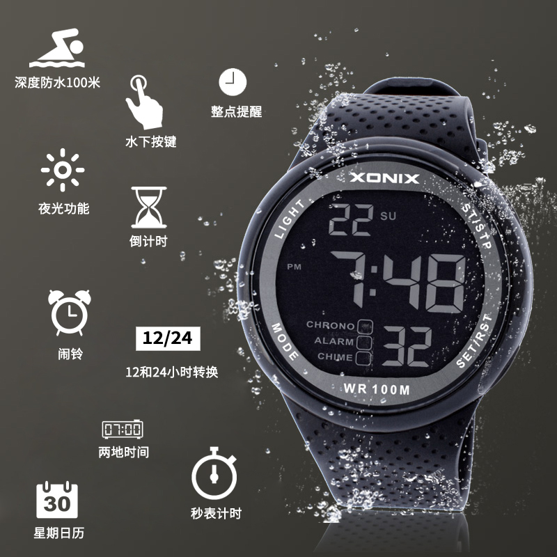 XONIX闹铃大数字学生潮流夜光计时游泳防水多功能运动电子手表男