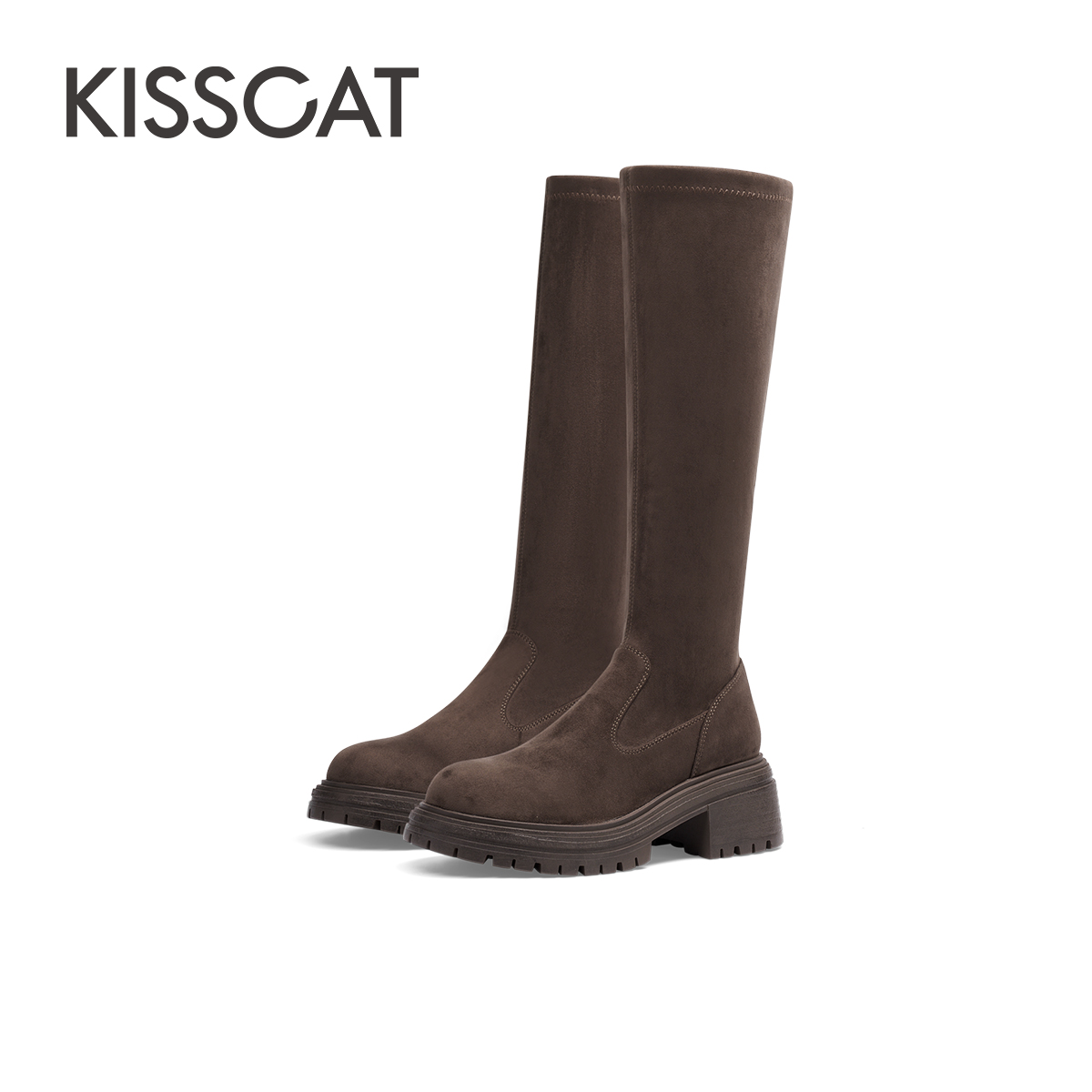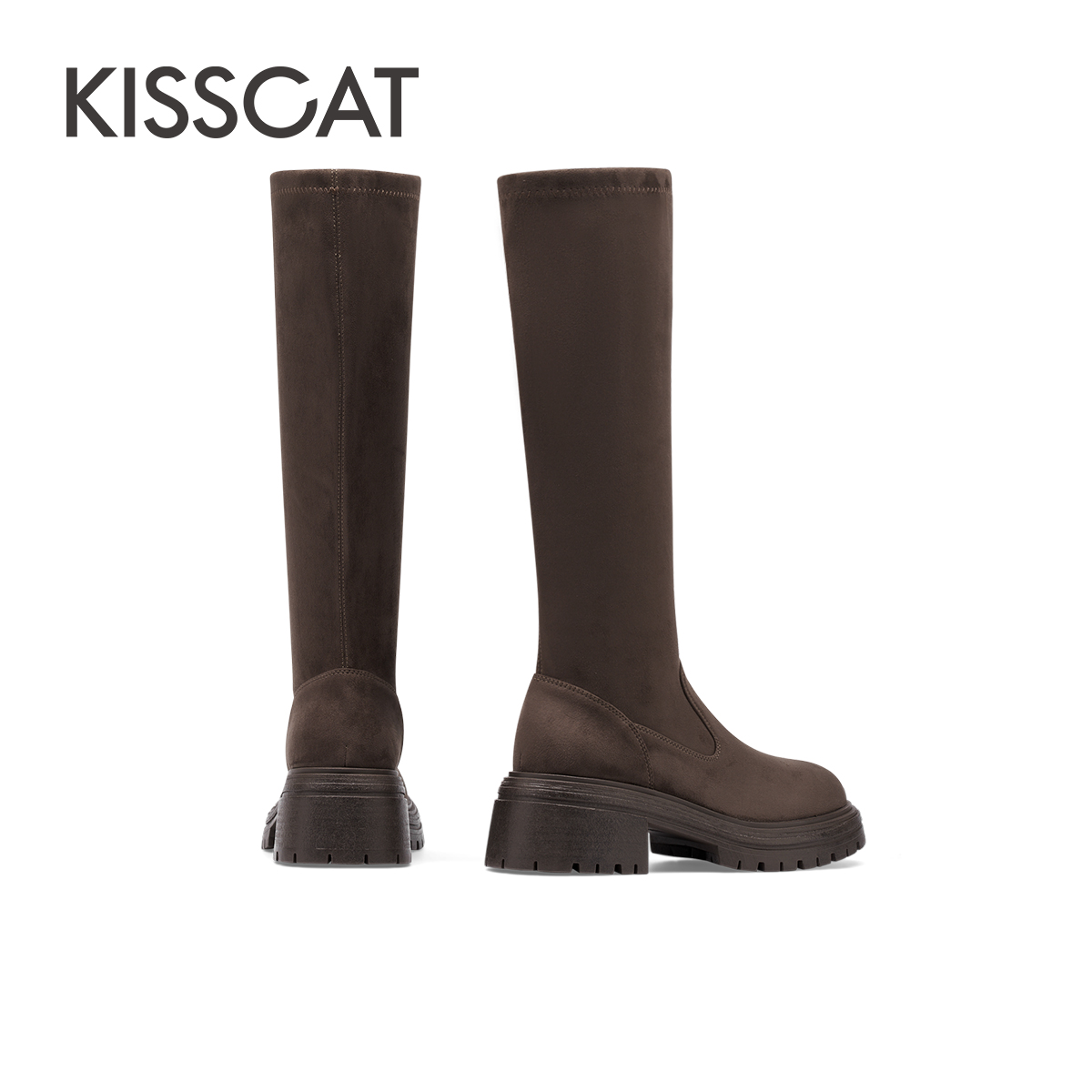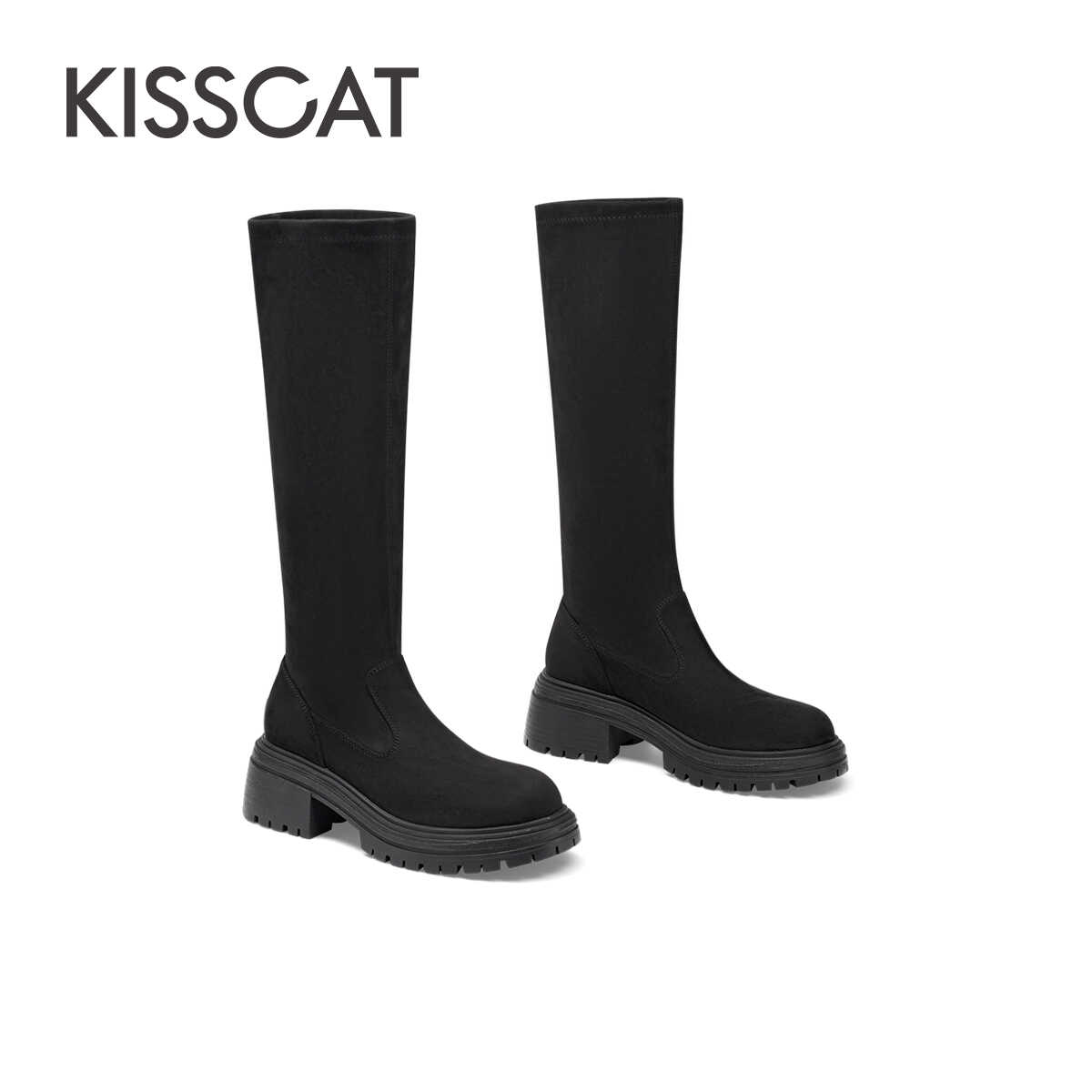 KISSCAT接吻猫新款黑色洋气高筒靴厚底通勤高靴百搭弹力靴女
