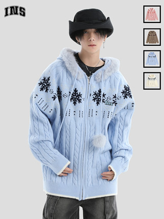 INSstudios 国潮牌情侣美式毛领费尔岛毛衣宽松连帽针织开衫外套