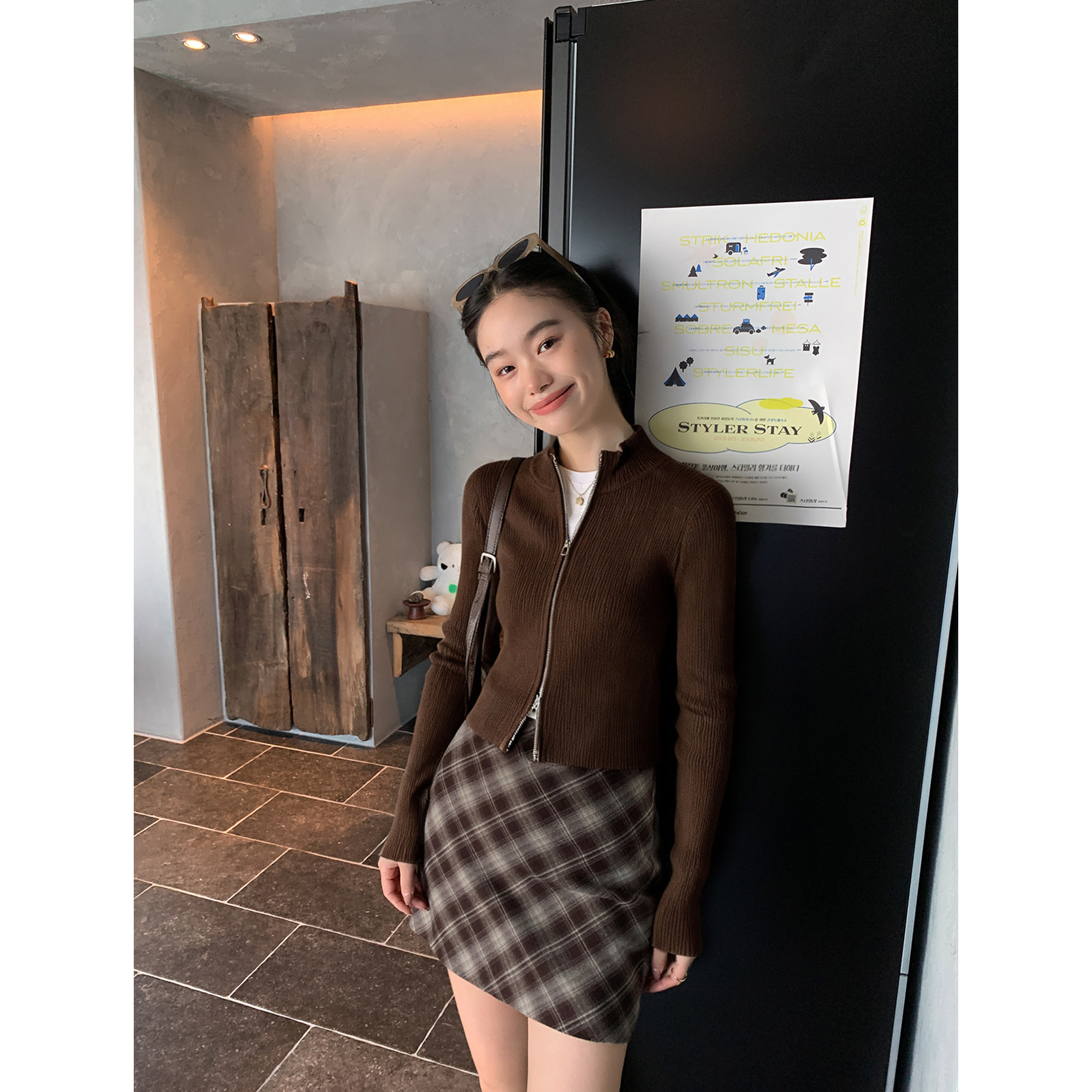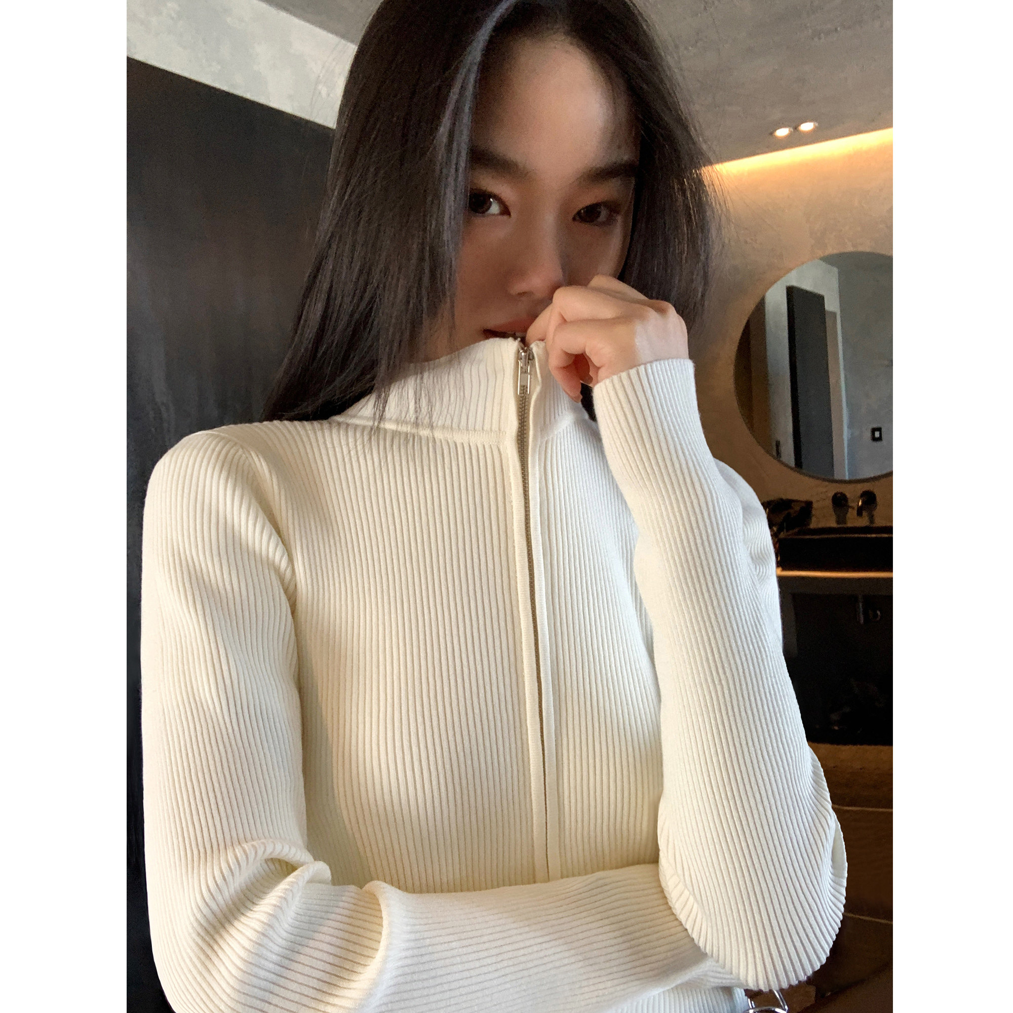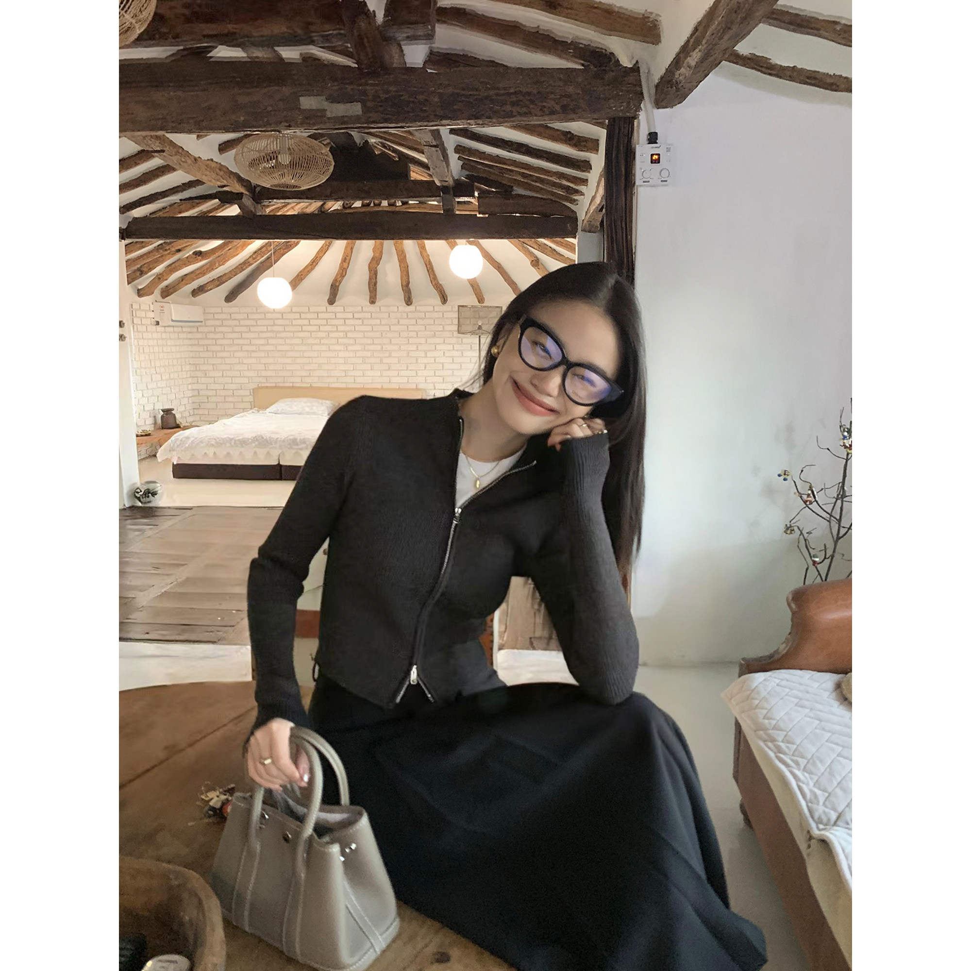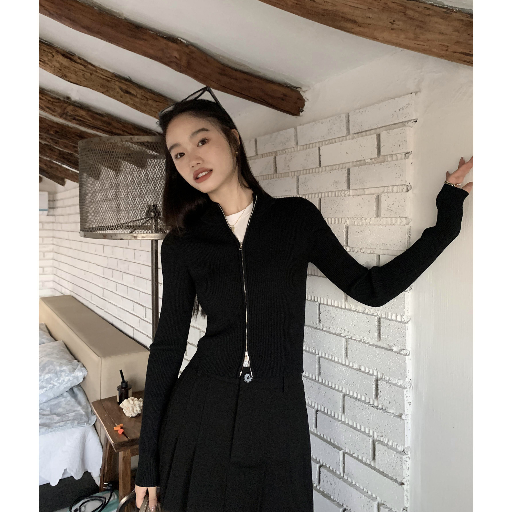 pusumede【现货7.5折】黑色半高领毛衣开衫女短款拉链针织上衣