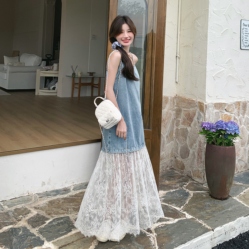 官网女装夏易菲实蕾丝下摆拼接牛仔吊带连衣裙女夏2025新款度假风
