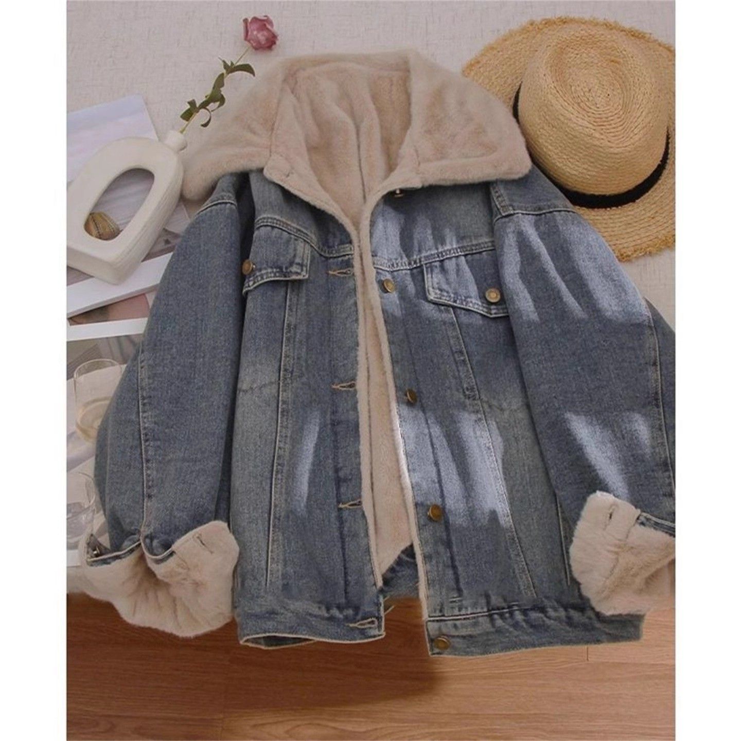 两面穿羊羔毛牛仔外套女冬季韩版BF休闲宽松加绒加厚棉服派克大衣