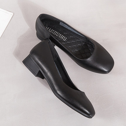 方头黑色工作鞋久站不累粗跟浅口软底皮鞋女中跟单鞋上班职业女鞋
