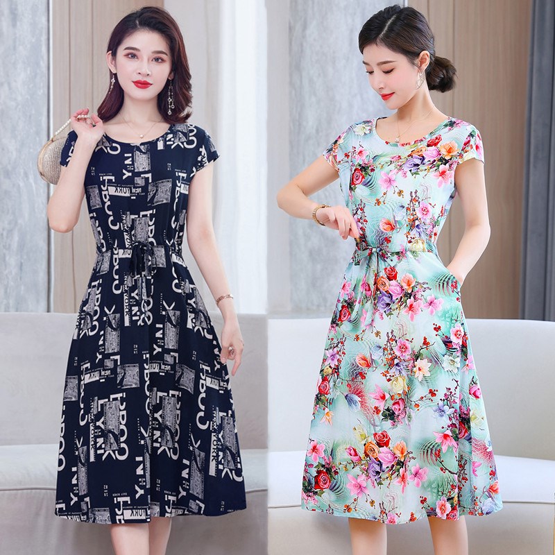 中老年棉绸连衣裙妈妈装圆领夏季女中长款大码显瘦有口袋碎花裙子