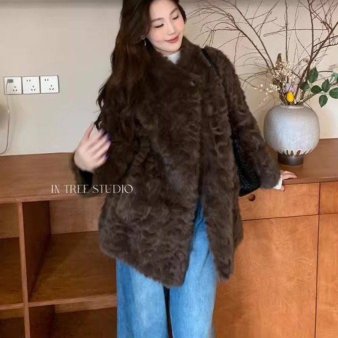 2025中长款皮毛一体立领时尚毛毛外套环保小胡羊冬季保暖女装外套