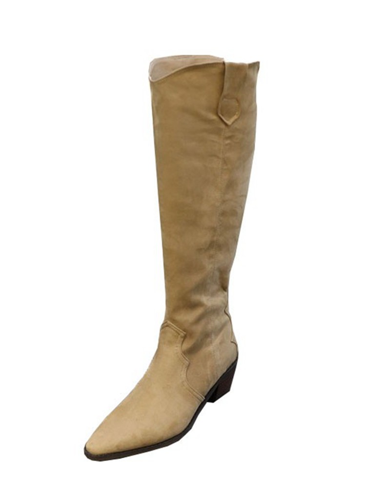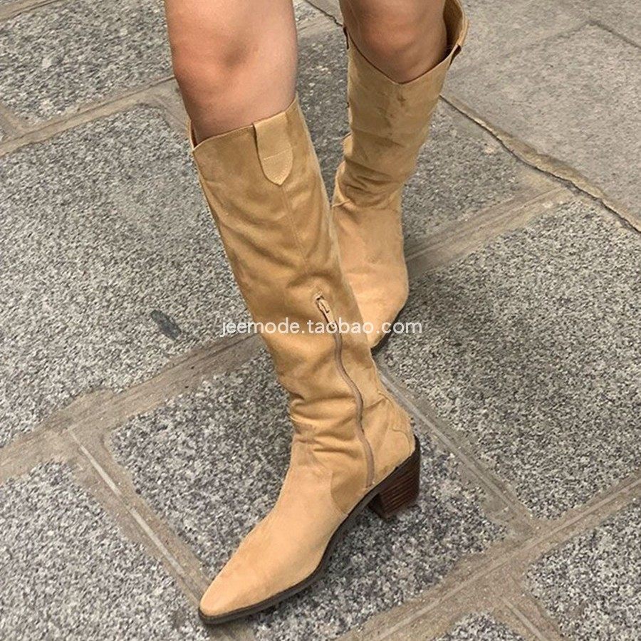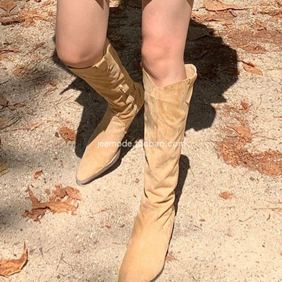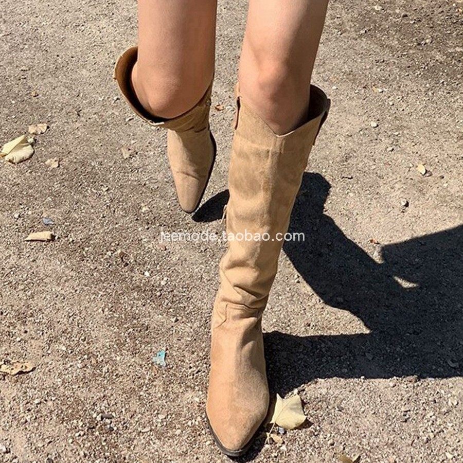 韩国东大门2023秋季新款尖头方跟复古套筒牛仔长筒ins潮骑士靴子