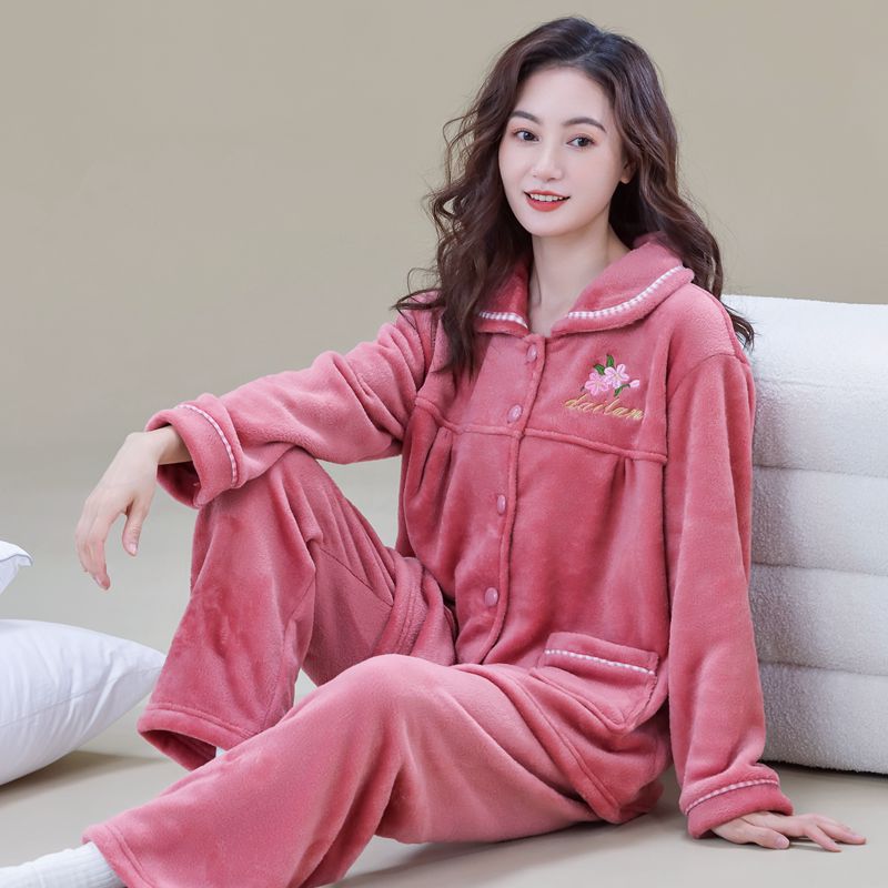 秋冬季珊瑚绒睡衣女冬加厚大码中老年妈妈装女士法兰绒家居服套装