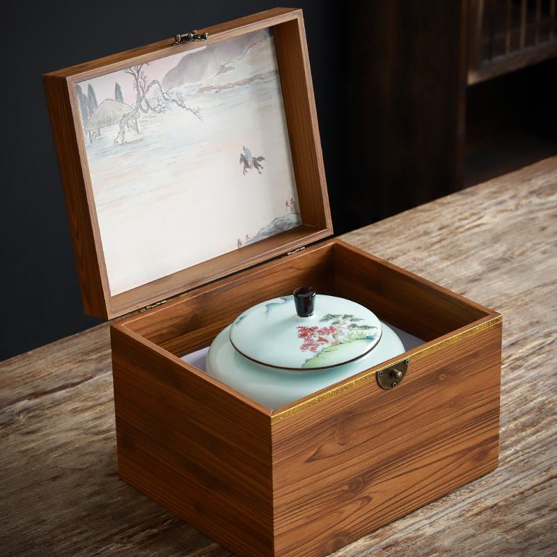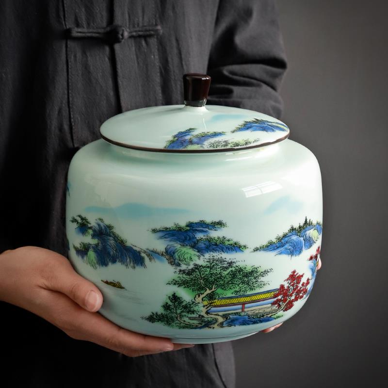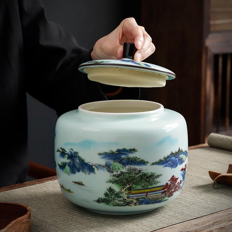 茶叶罐陶瓷茶罐存储罐送礼高档礼盒复古中式山水画茶缸大号密封罐