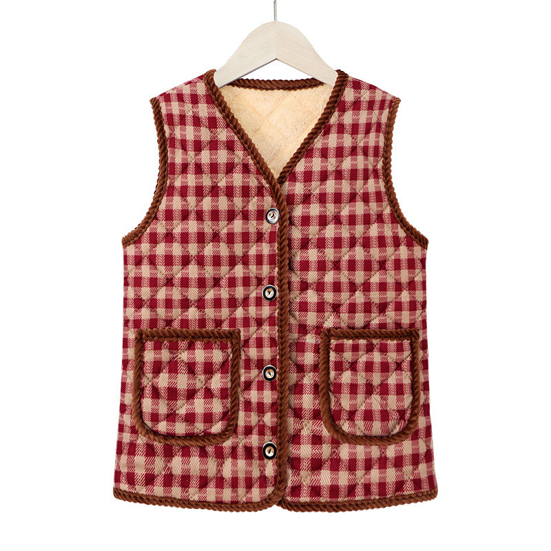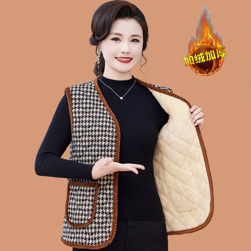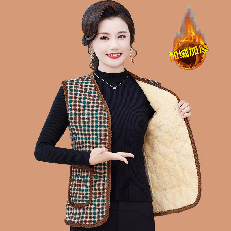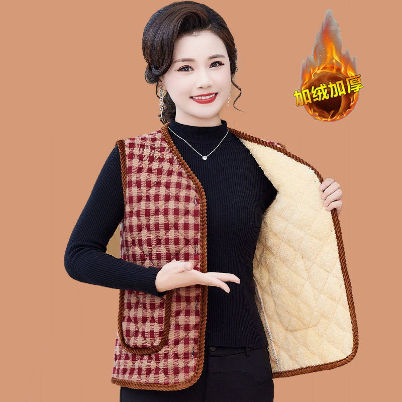 妈妈冬装加绒加厚格子马甲中老年女装百搭背心保暖打底坎肩小棉衣