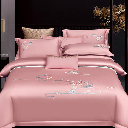 粉色刺绣床品四件套纯棉全棉