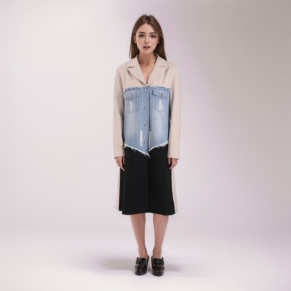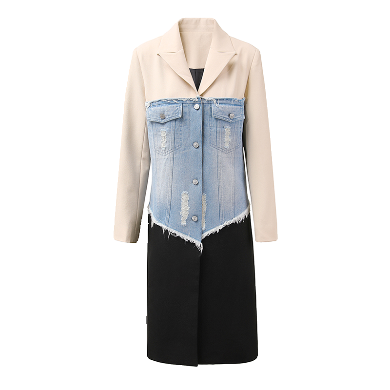 EAM STUDIO复古拼色宽松高级感牛仔拼接中长款风衣外套女春秋新款