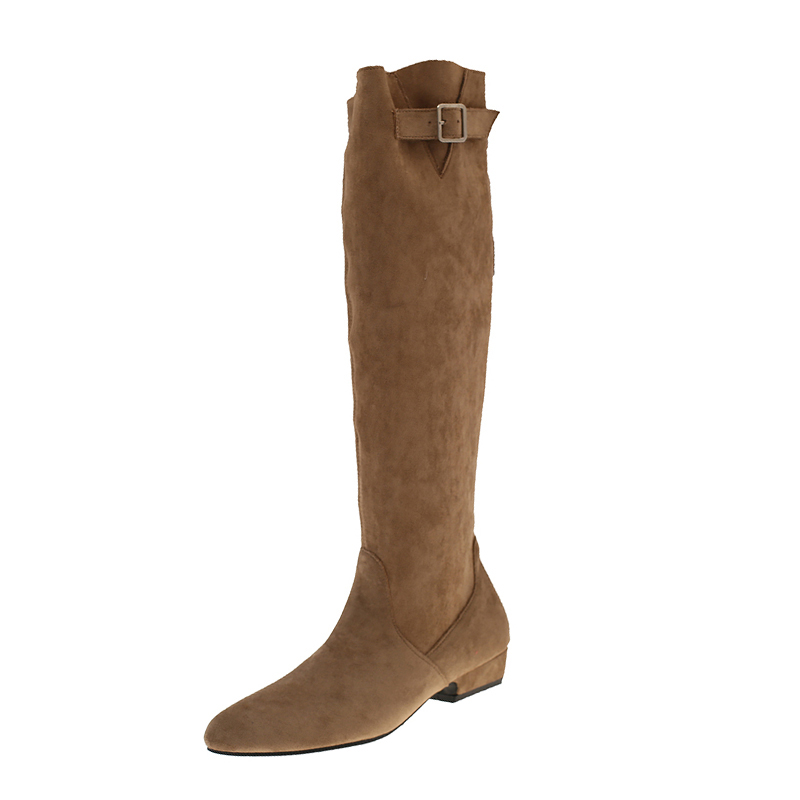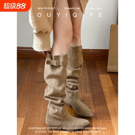 真皮版~慵懒感女冬复古堆堆靴法式显瘦高筒靴粗跟绒面卡其色长靴