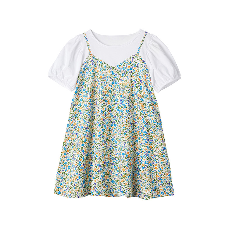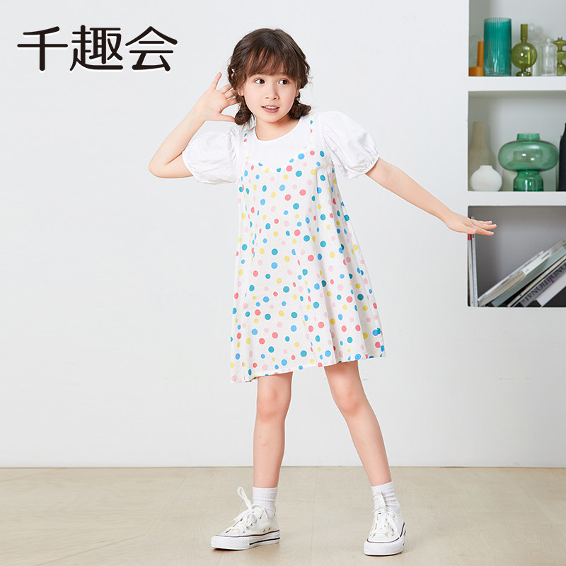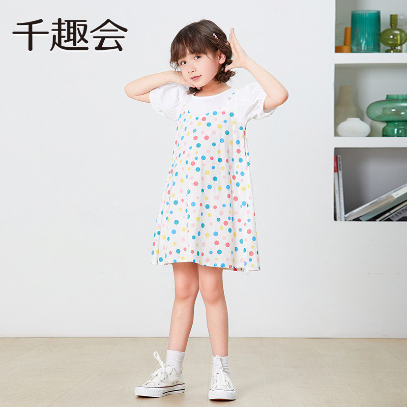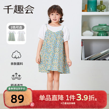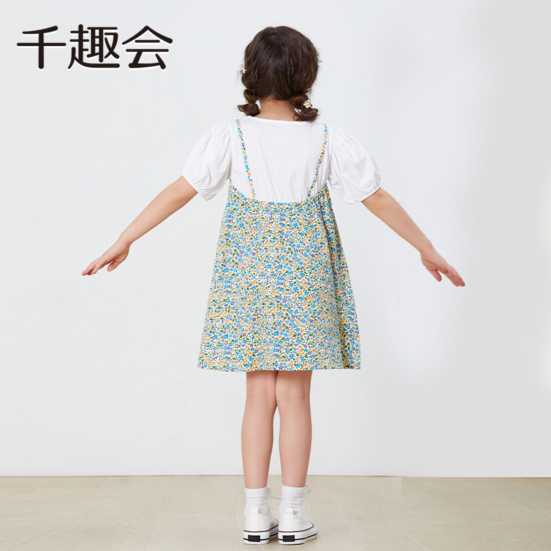 千趣会童装夏款女童清新印花甜美棉质叠穿风假两件连衣裙