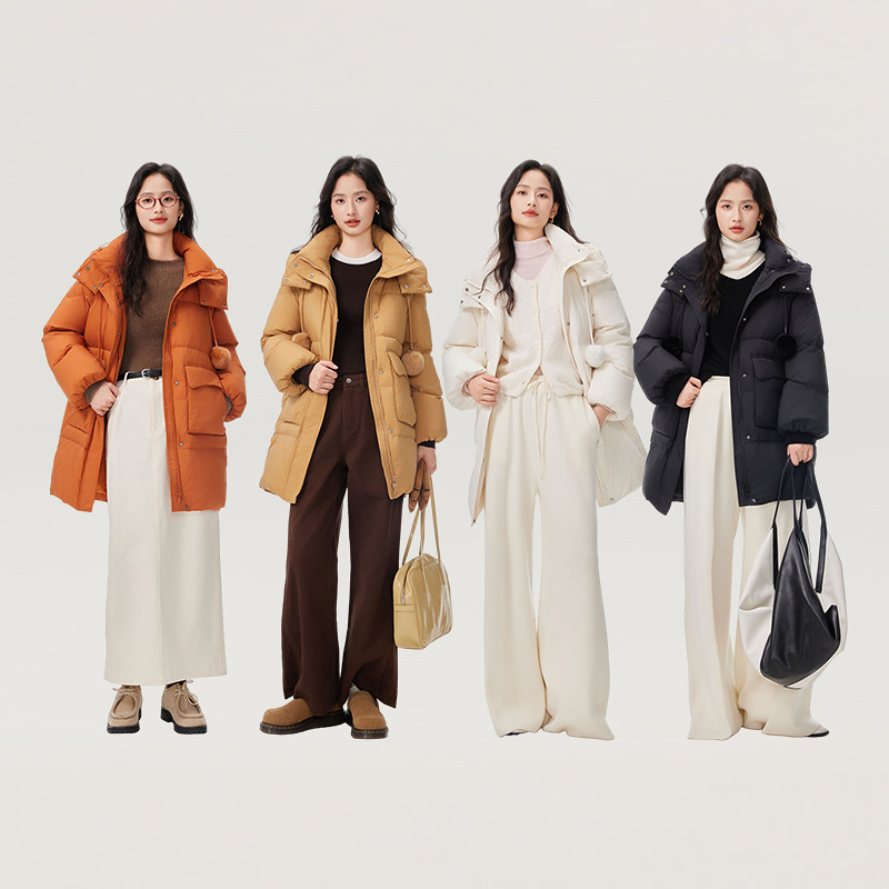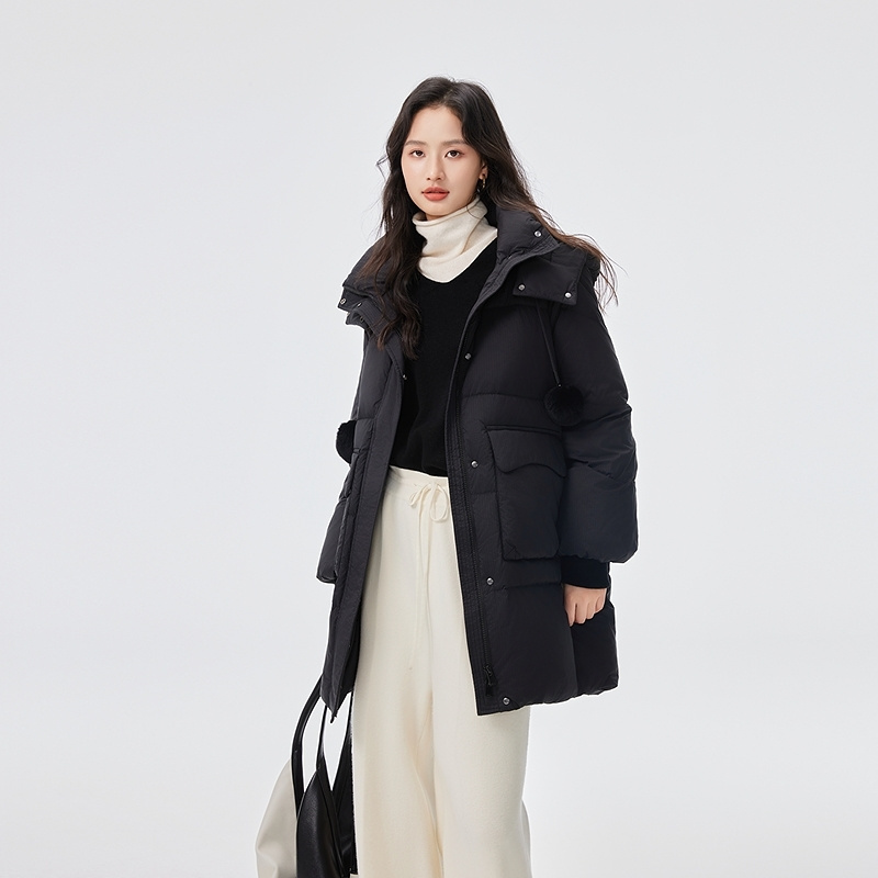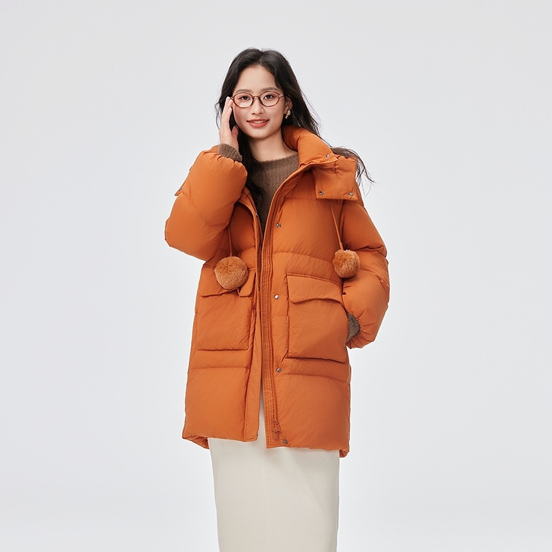 艾莱依时尚毛球中长款羽绒服商场同款宽松大口袋时尚连帽外套女士