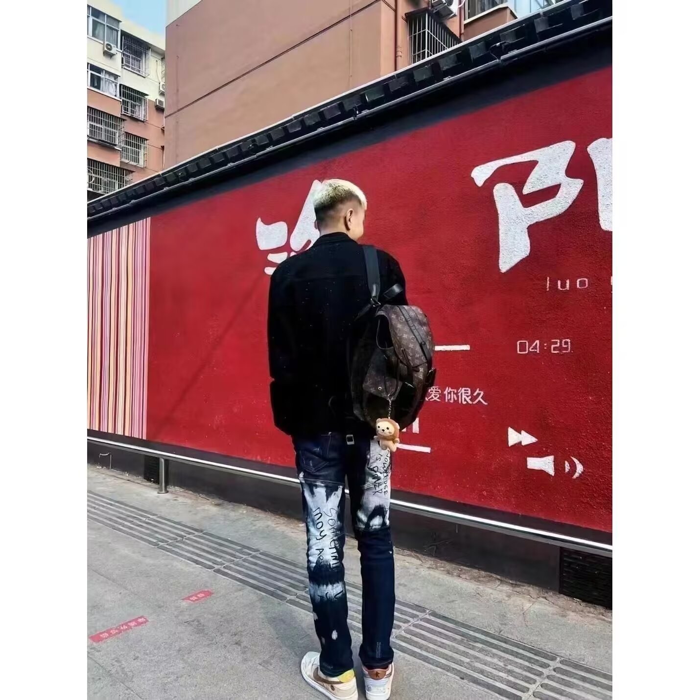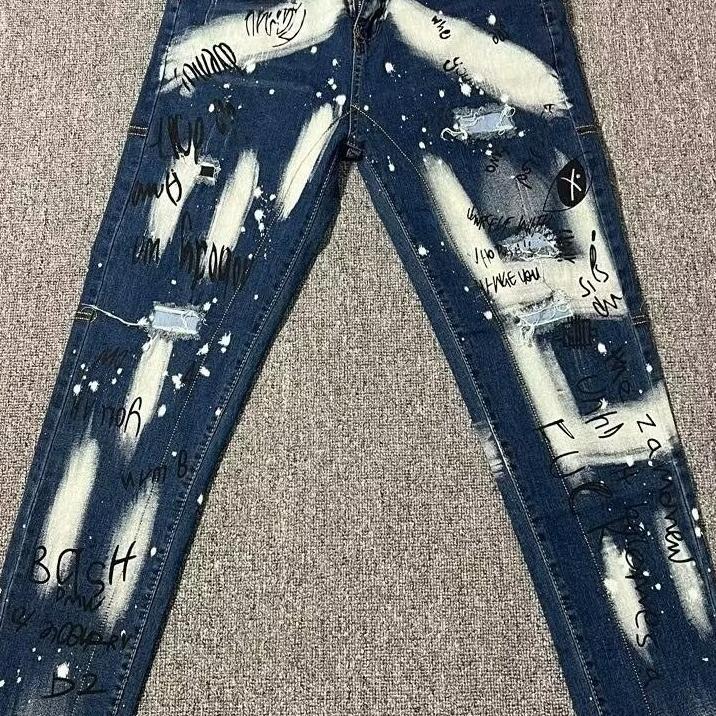 秋季时尚新款网红涂鸦字母牛仔裤男潮牌补丁破洞修身弹力小脚长裤