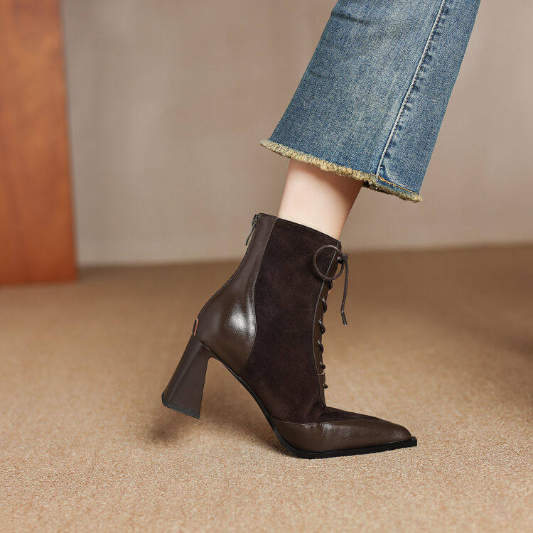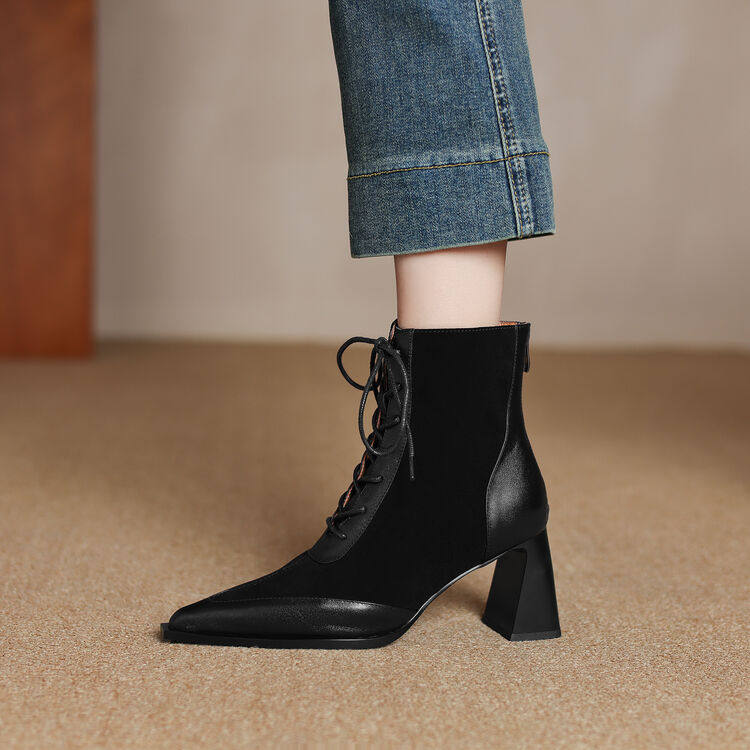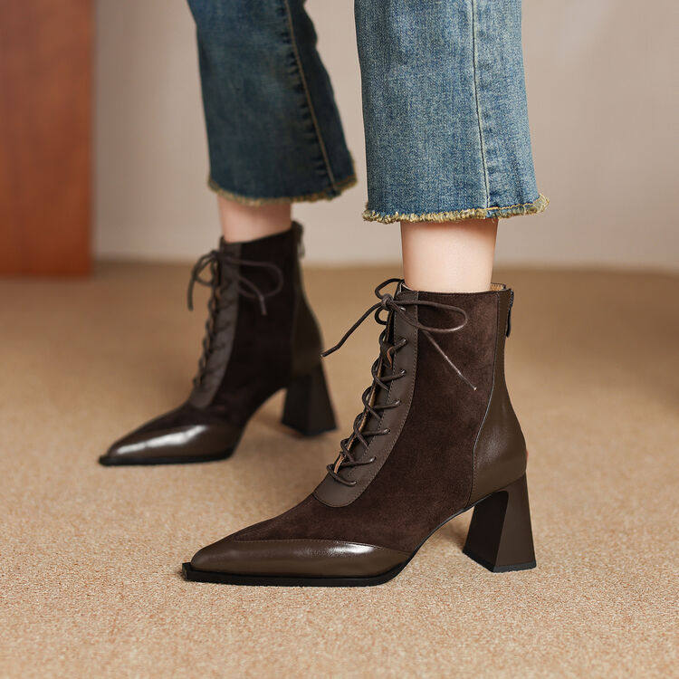 巨好看~真皮羊翻皮短靴女单靴前系带交叉绑带尖头粗高跟拼色百搭