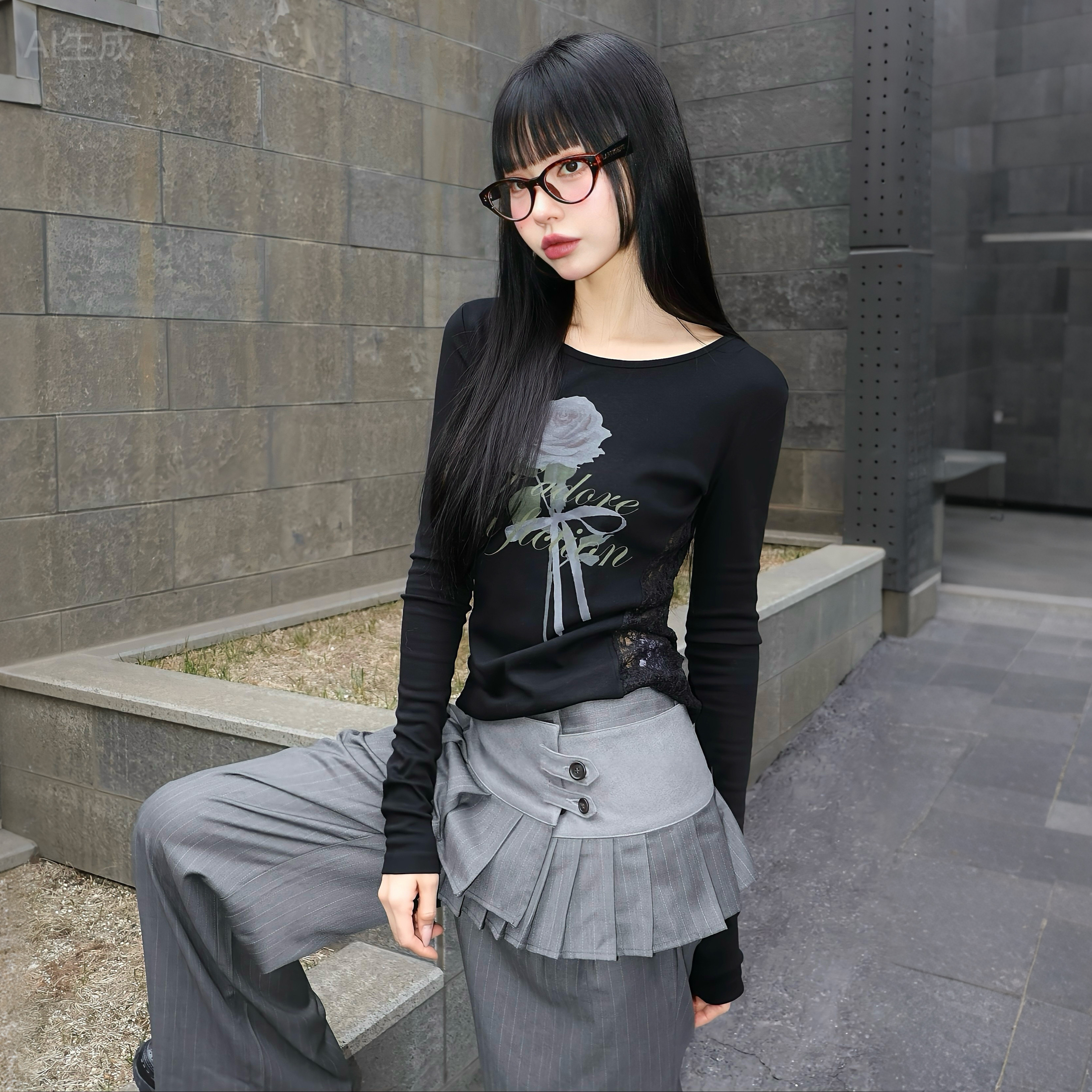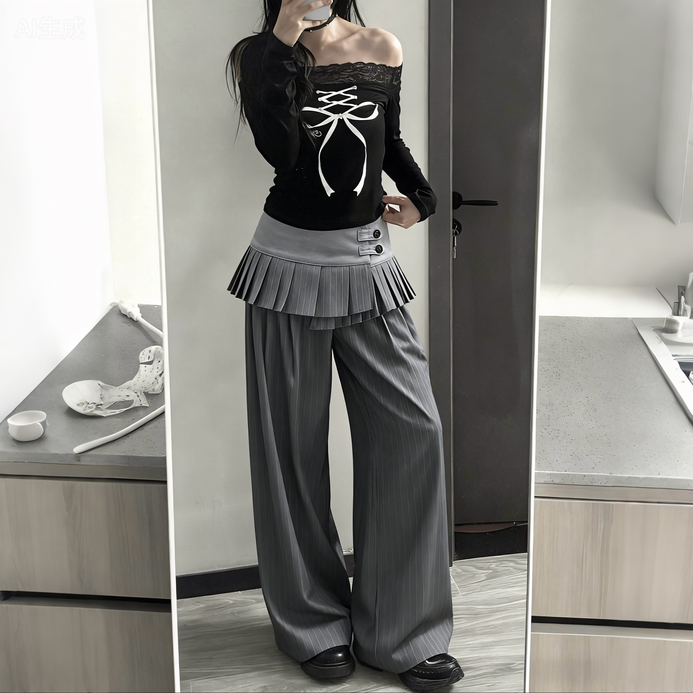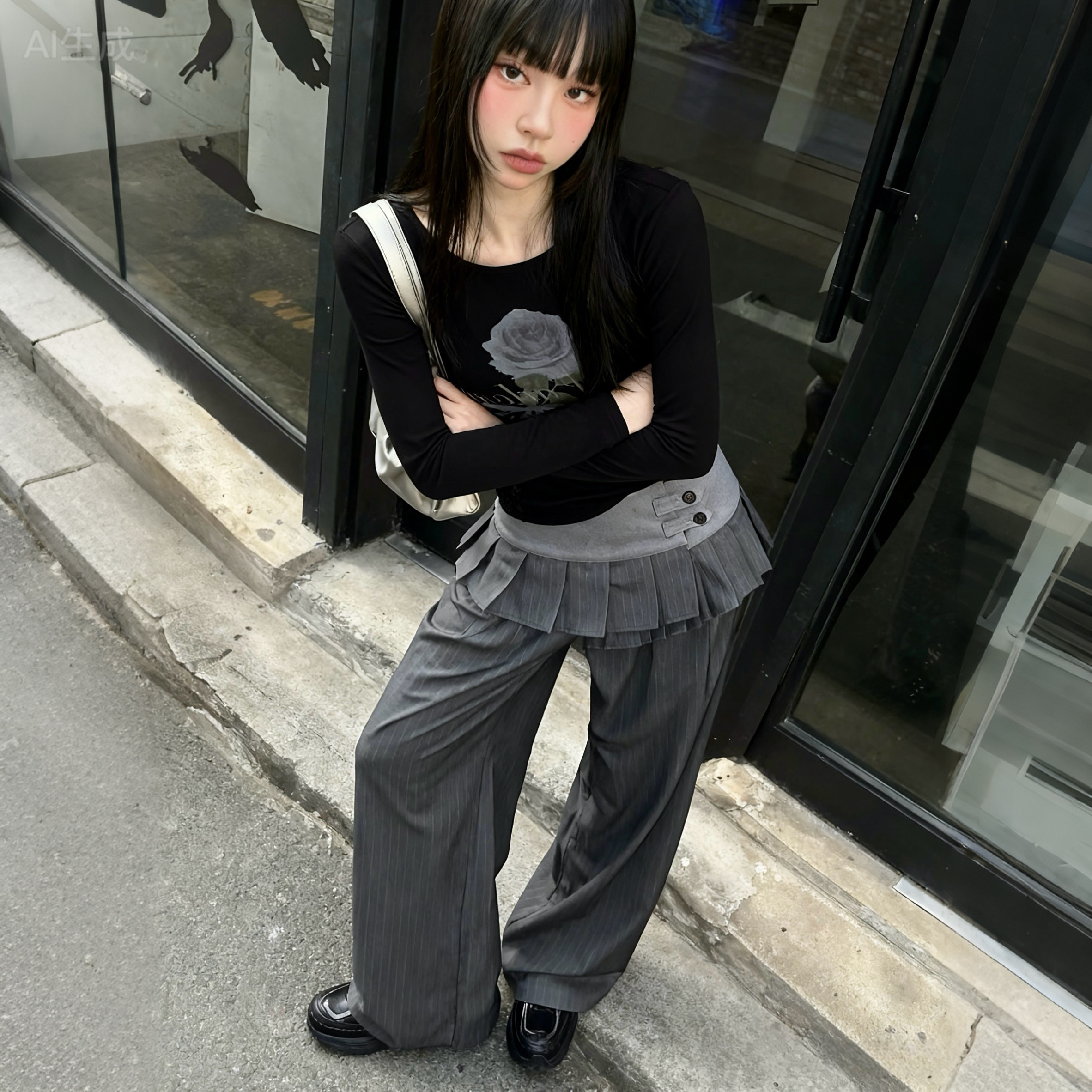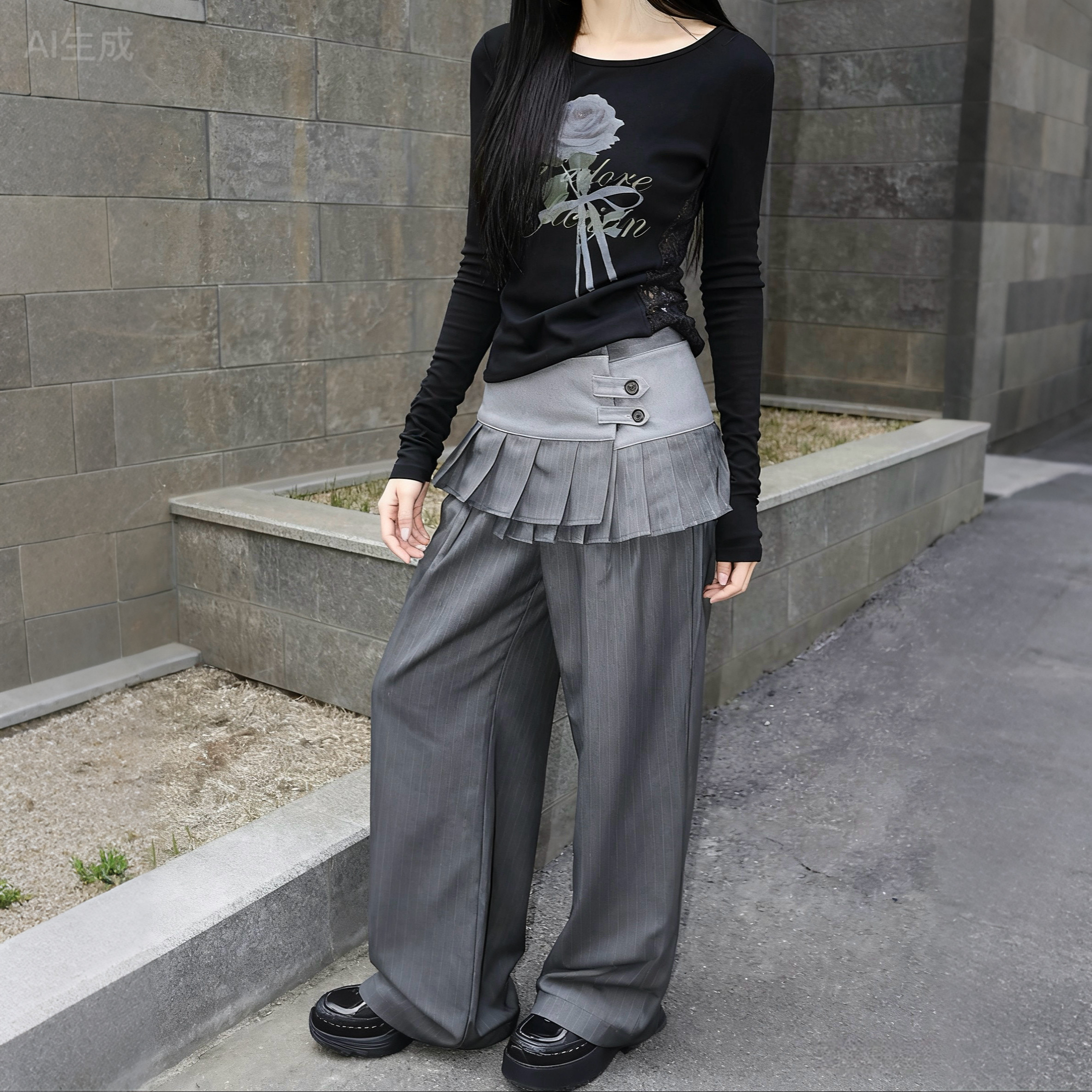 REOY Stu”韩系复古设计慵懒随性灰色西装裤百褶裙叠穿两件套装