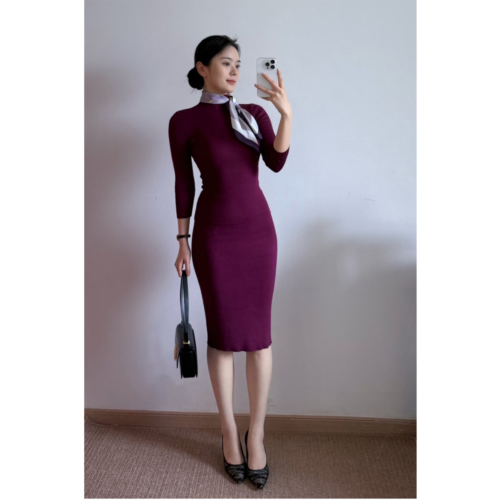 春秋新款半高领高腰女款黑色连衣裙复古长袖包臀裙两件套装气质