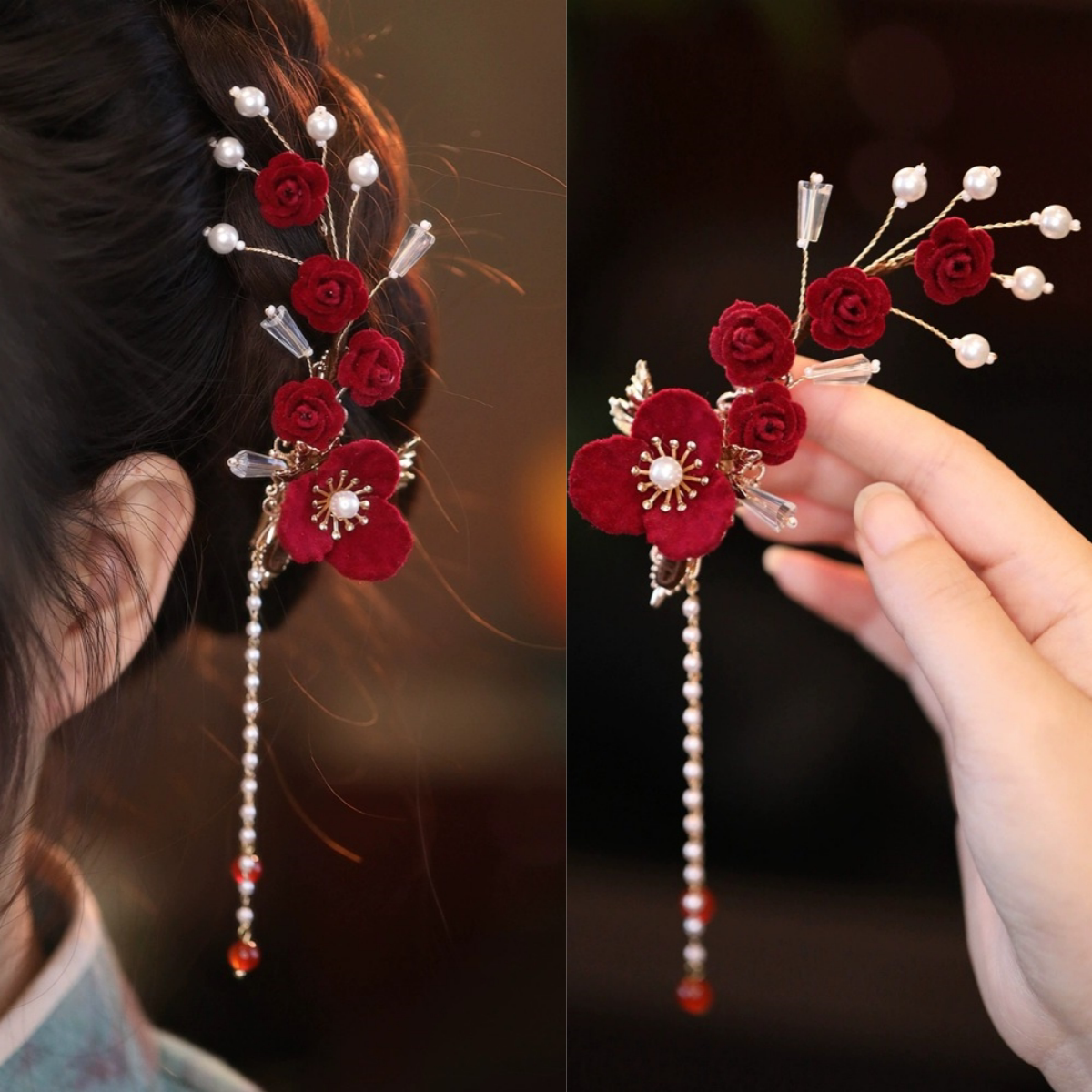 高级感红色山茶花流苏发夹女新娘订婚晚礼服红玫瑰发卡盘发夹头饰