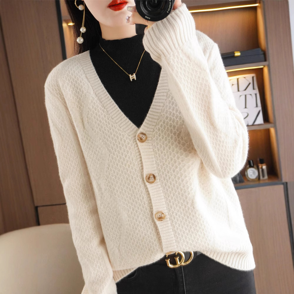 跨境秋冬慵懒风针织衫V领开衫韩版气质宽松修身百搭毛衣女士外套