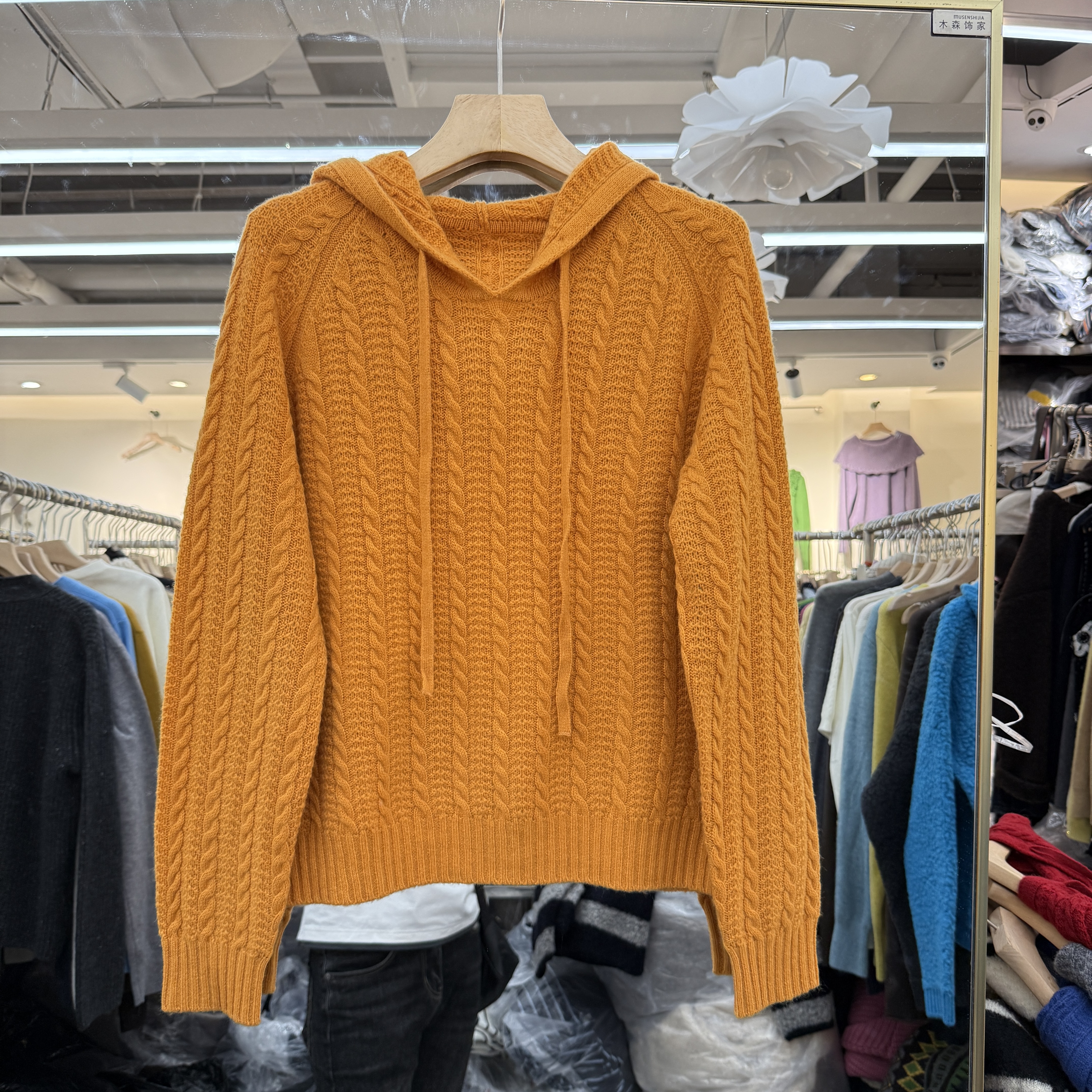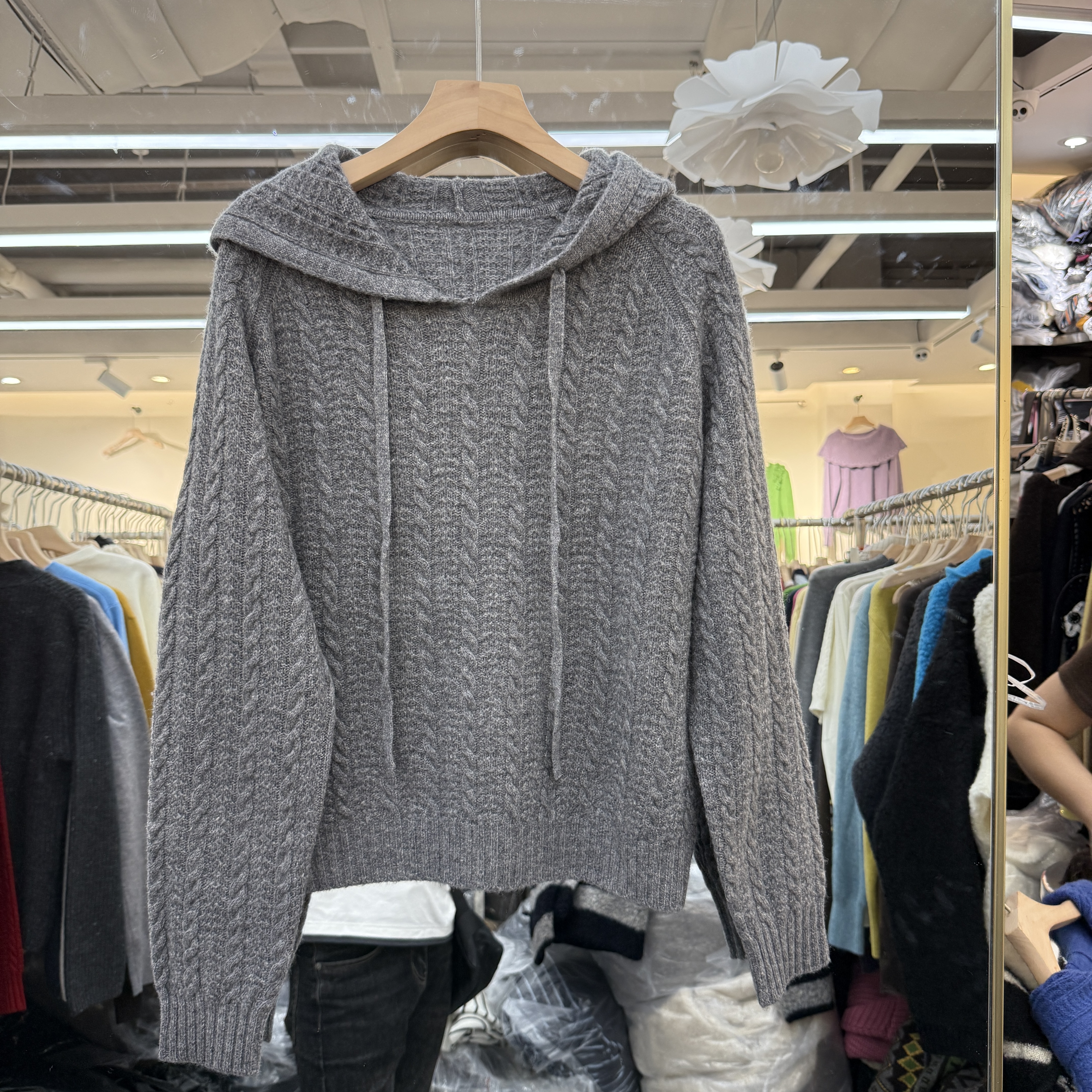 欧洲站2025秋冬新款连帽抽绳纯色宽松百搭慵懒风女士羊毛针织毛衣