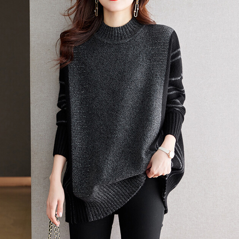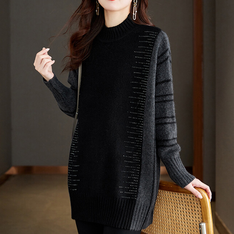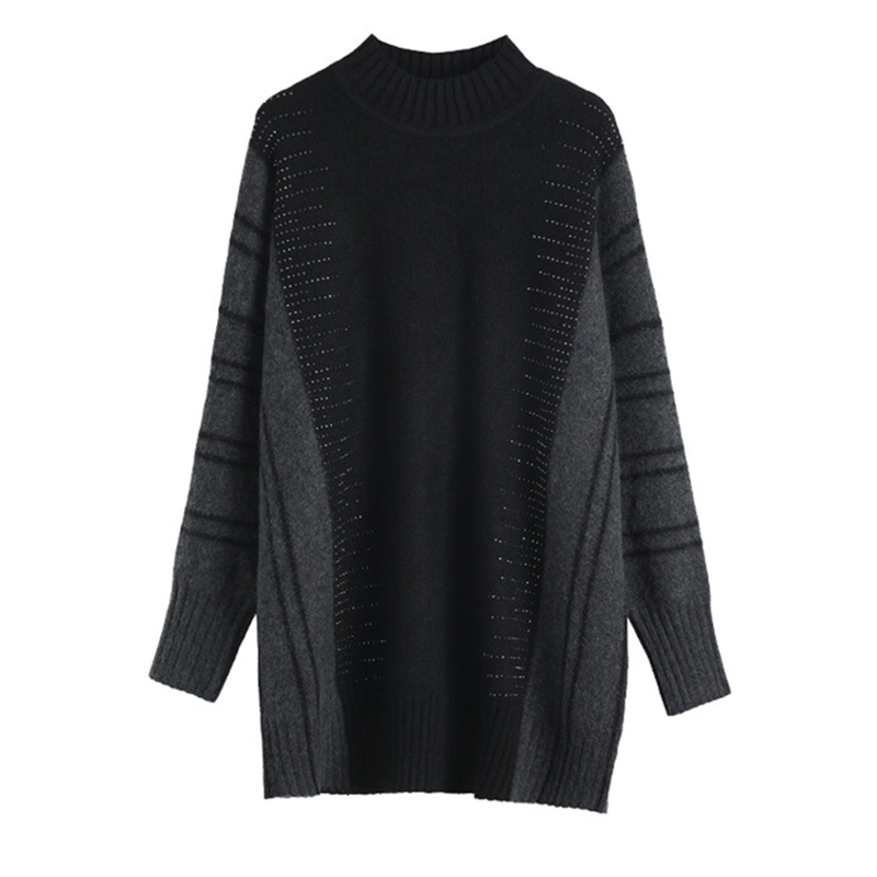 厚款打底衫宽松加大码秋冬女保暖羊毛针织衫拼色百搭中长款毛衣裙