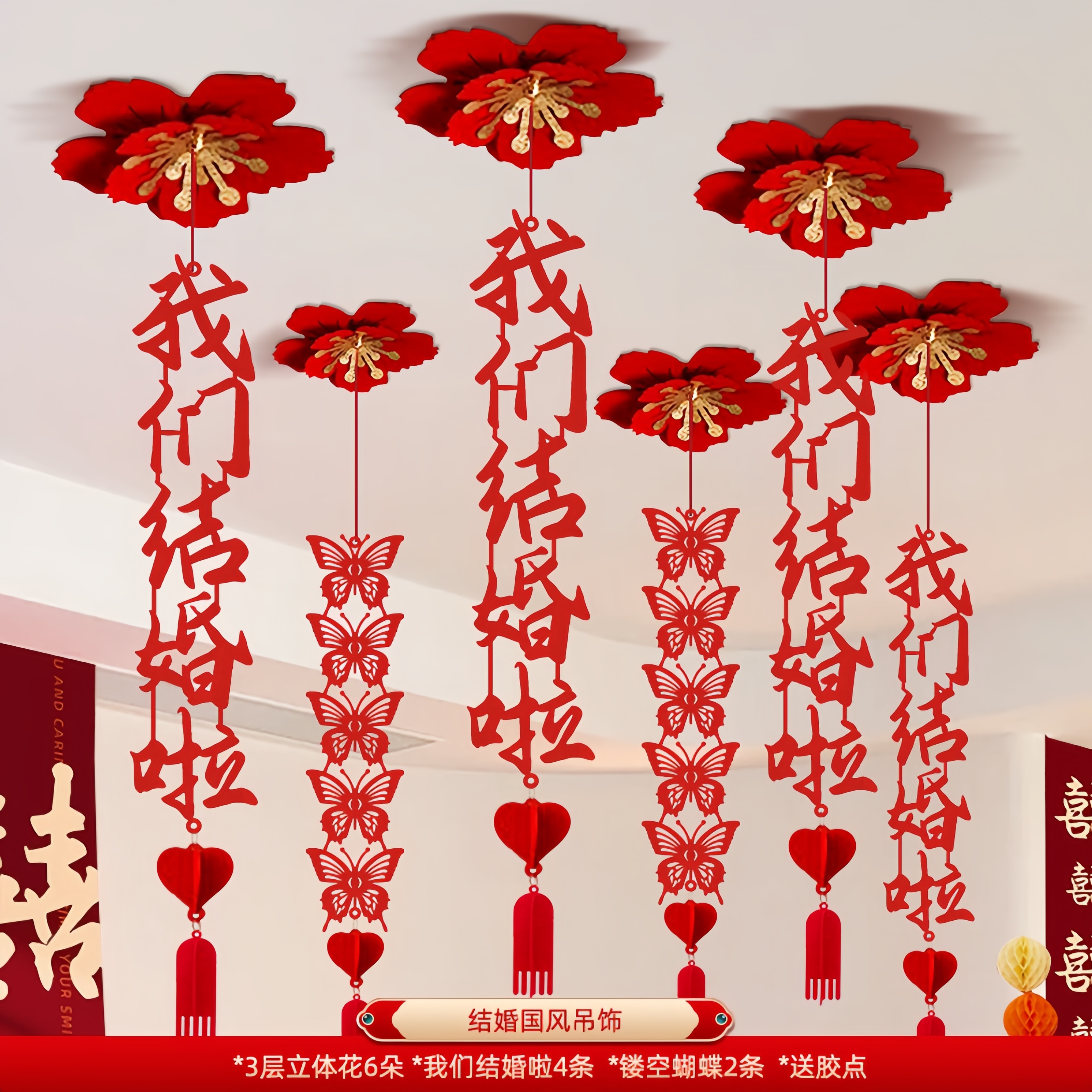 婚房布置套装男方结婚新房装饰客厅卧室天花板吊顶立体喜字灯笼囍