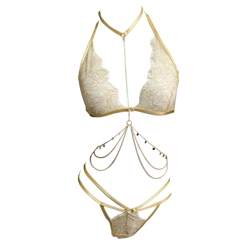 Lady内衣性感小胸蕾丝垂链纯欲三点式套装女胸罩情趣qqny趣情诱惑