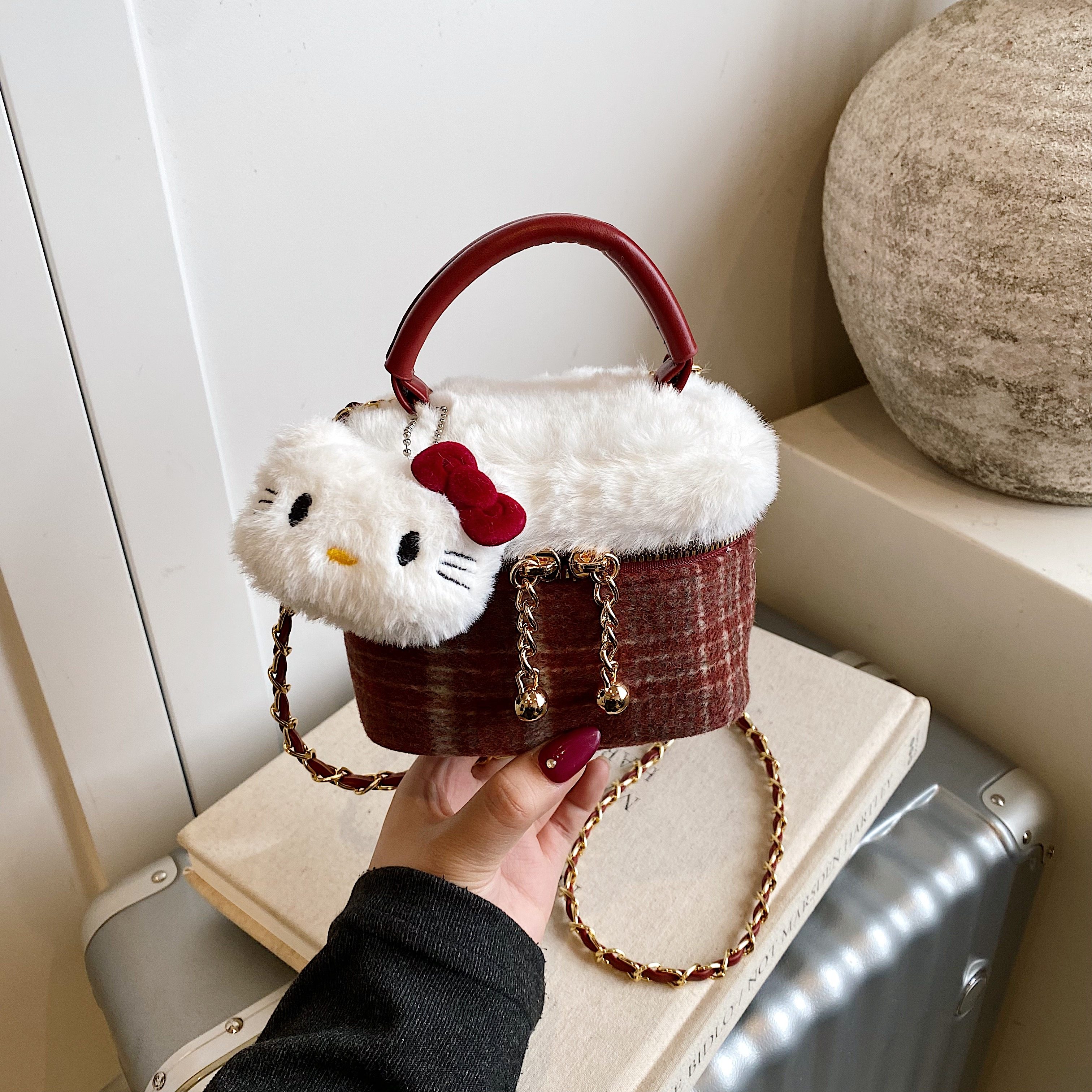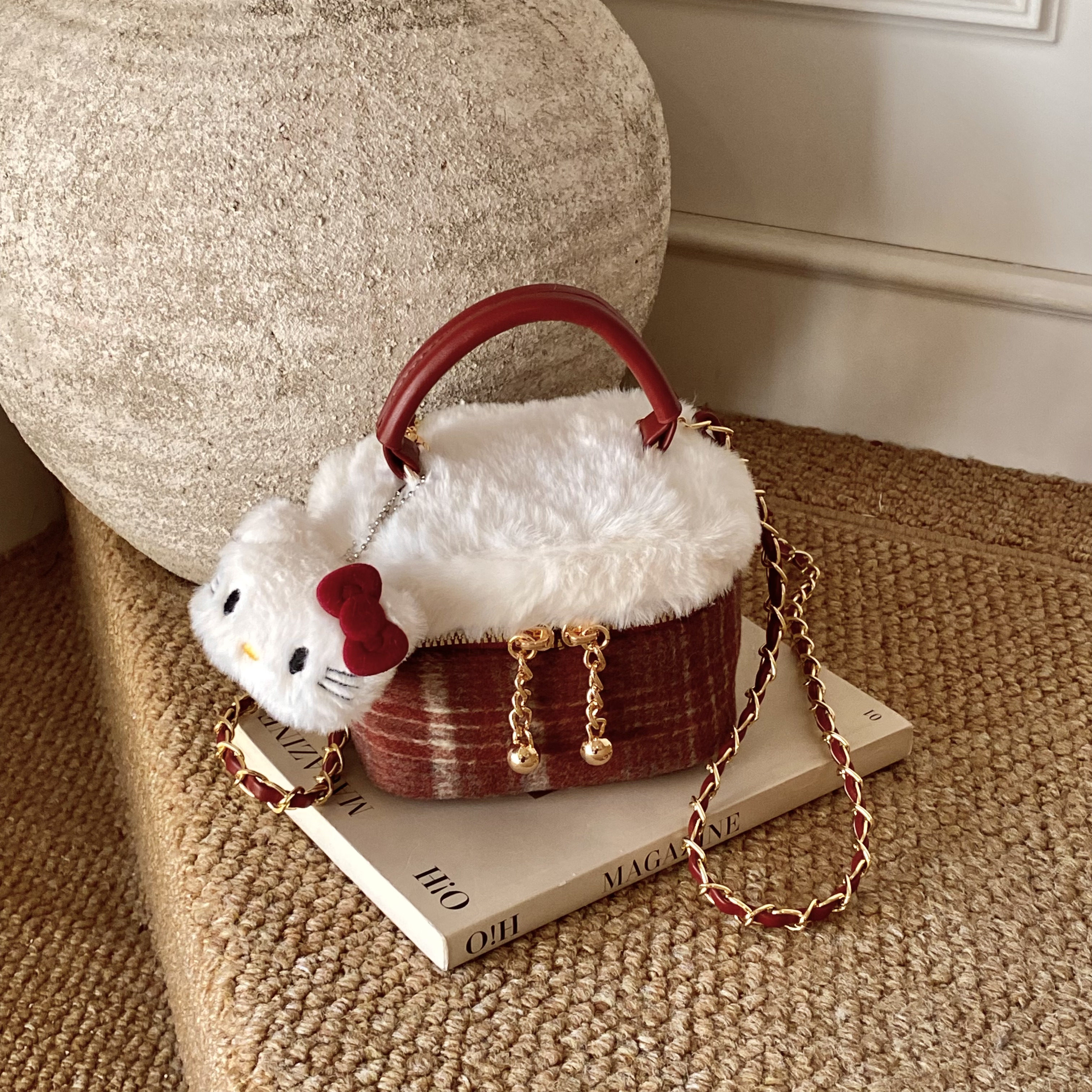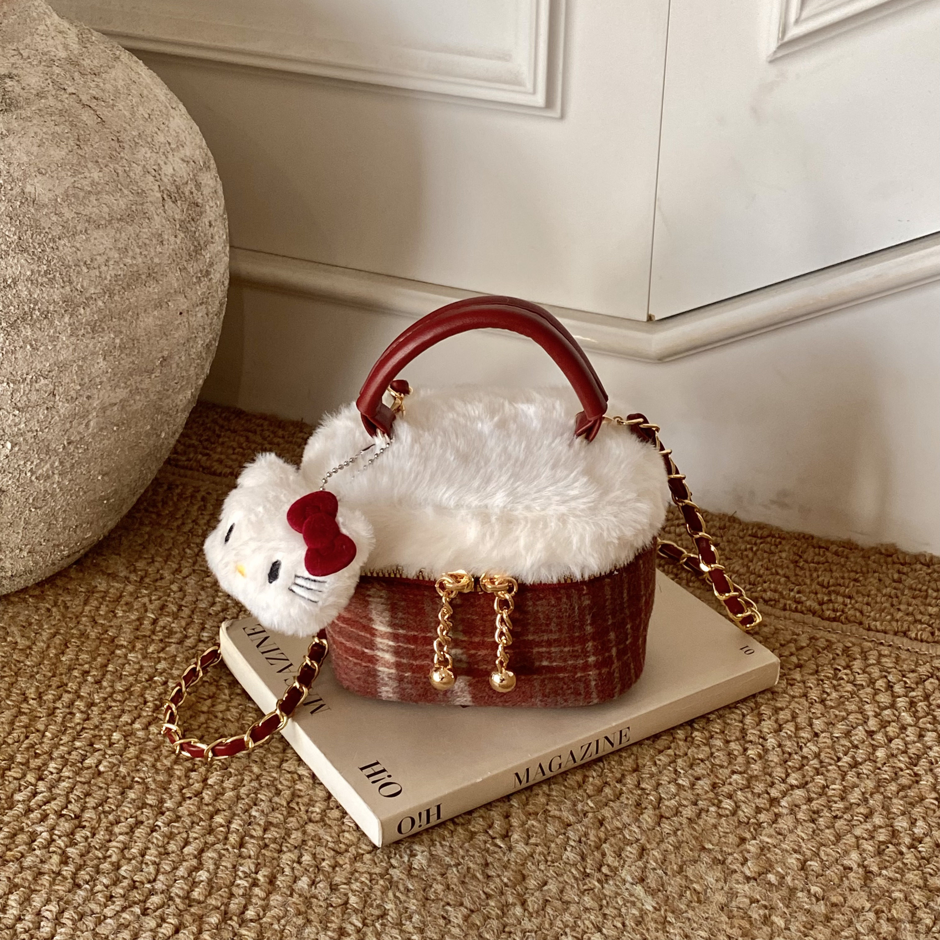 可爱儿童包包2025秋冬毛绒包迷你链条盒子包红色格纹女童斜挎包潮