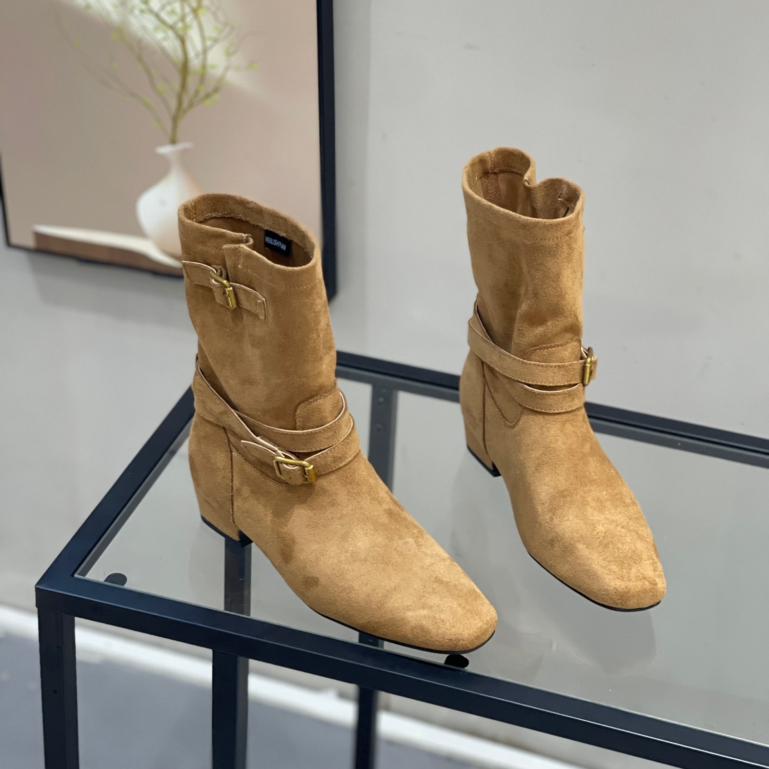 复古小众西部牛仔靴女2025秋冬新款爆款皮带扣方头粗跟中筒马丁靴