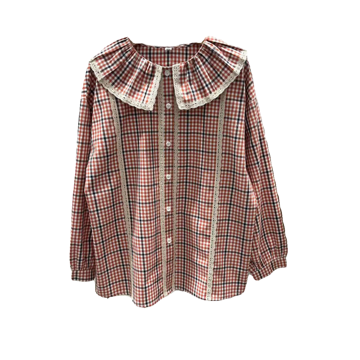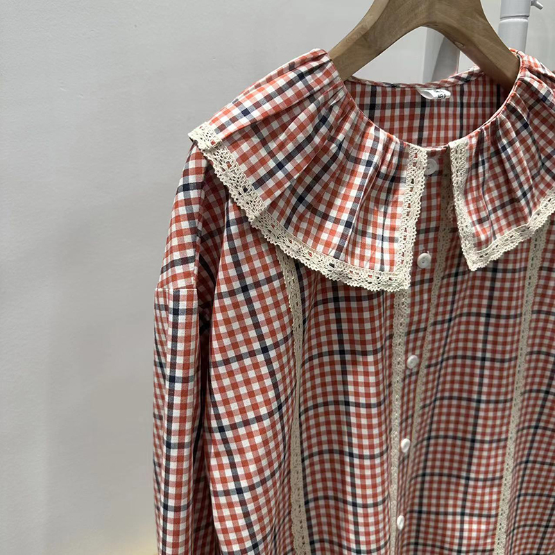 春秋新款桔色格子长袖女衬衫杏色花边百搭橘色单排扣均码淑女上衣