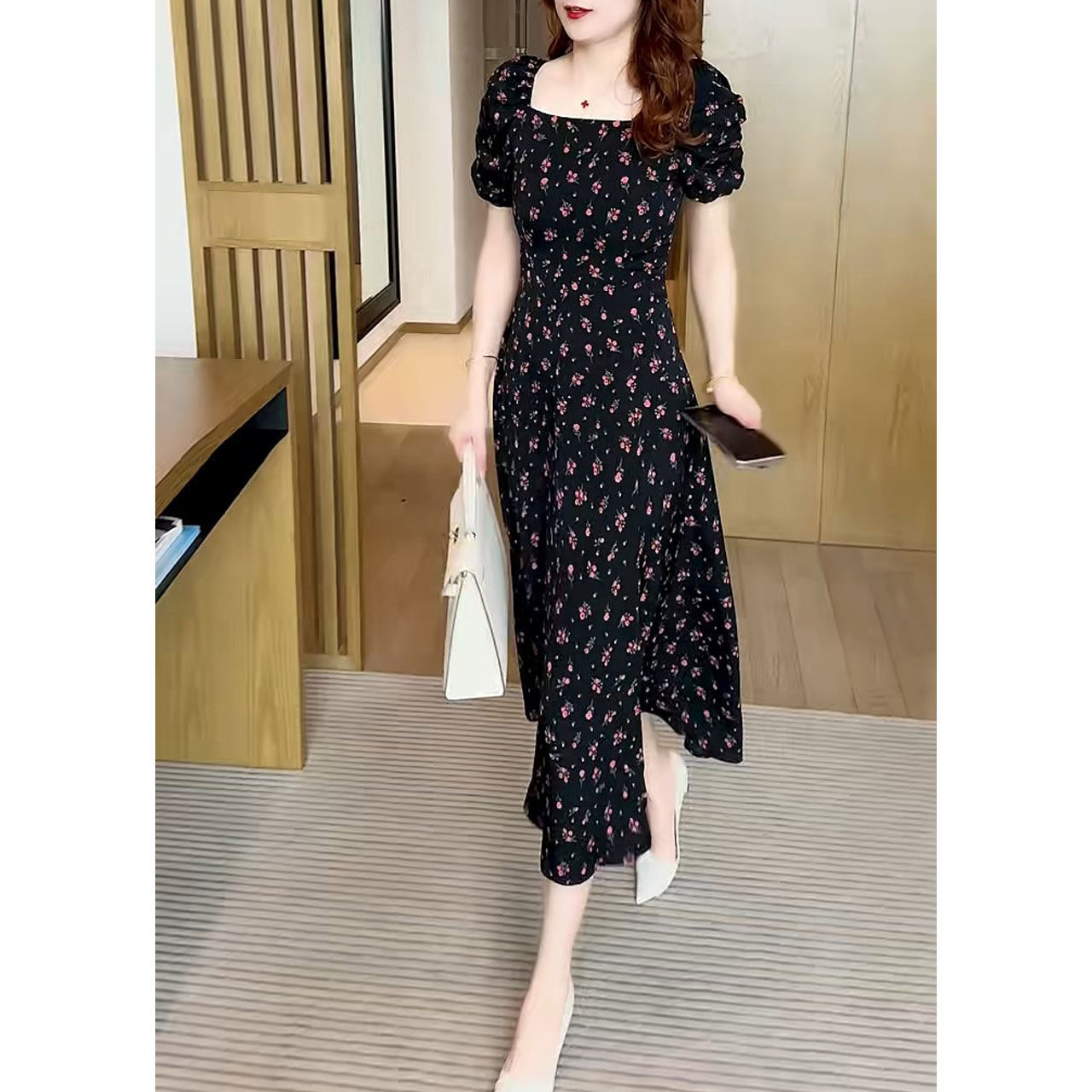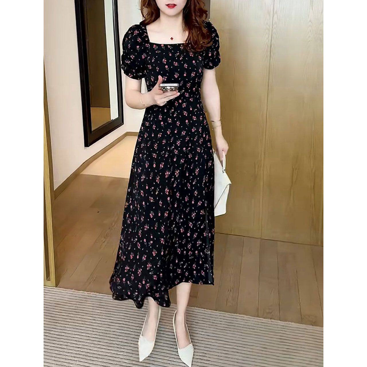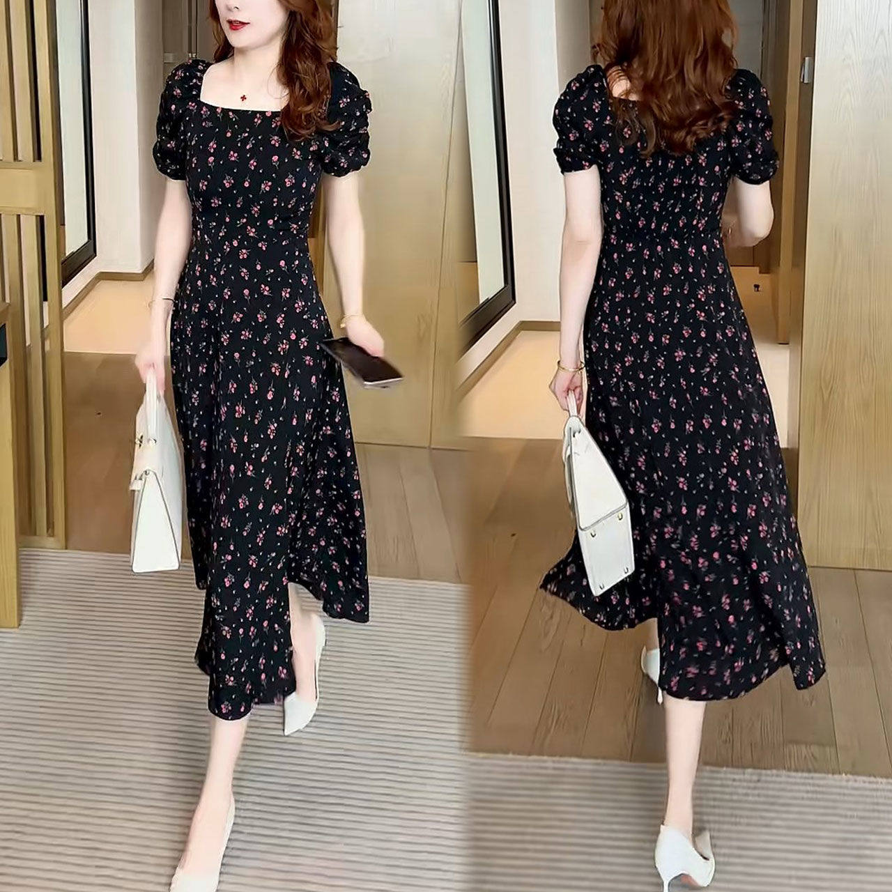 2025夏季新款气质方领泡泡袖中长款开衩裙子时尚短袖碎花连衣裙女