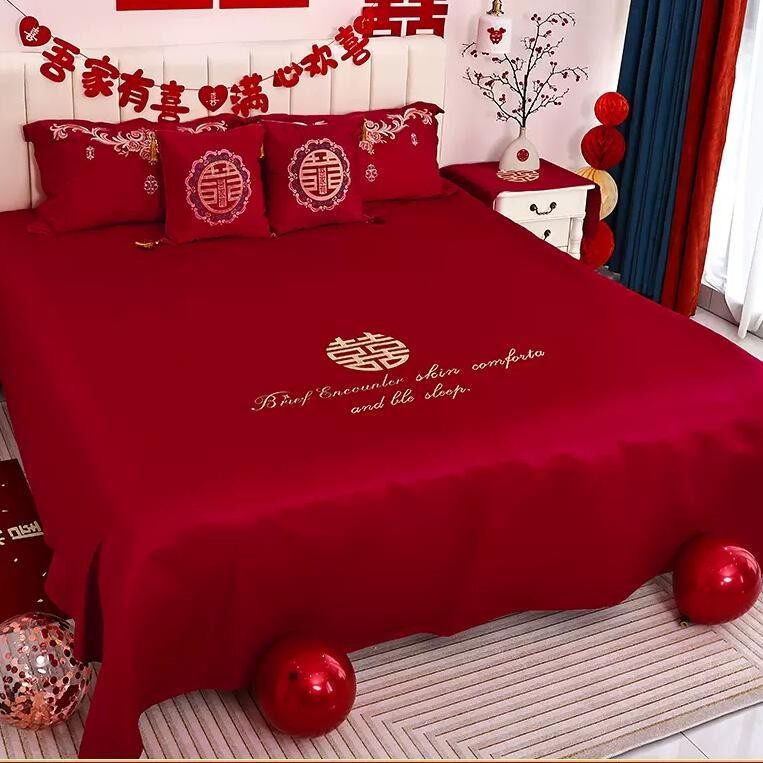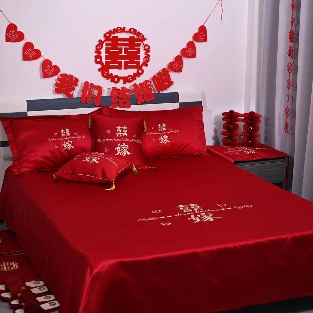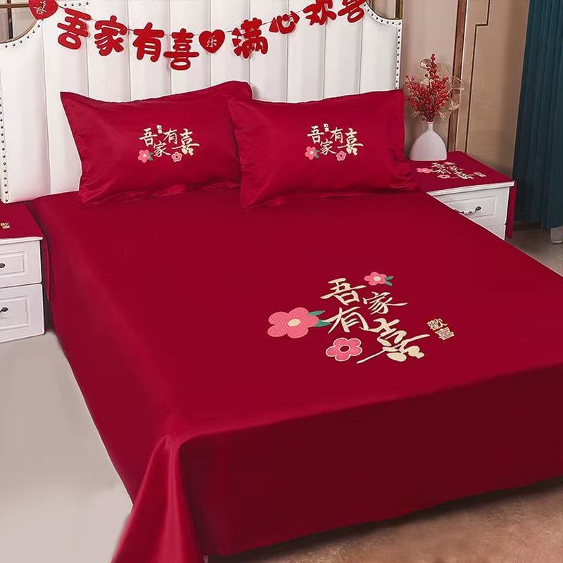 结婚喜庆床上用品陪嫁大红色床单简约结婚用品女方必买刺绣枕套
