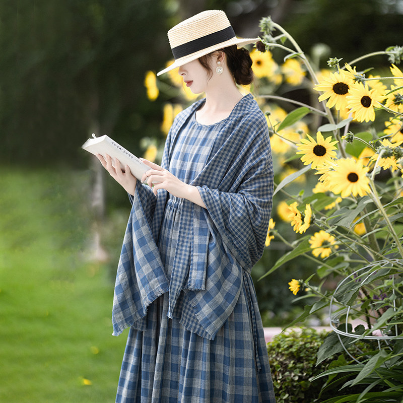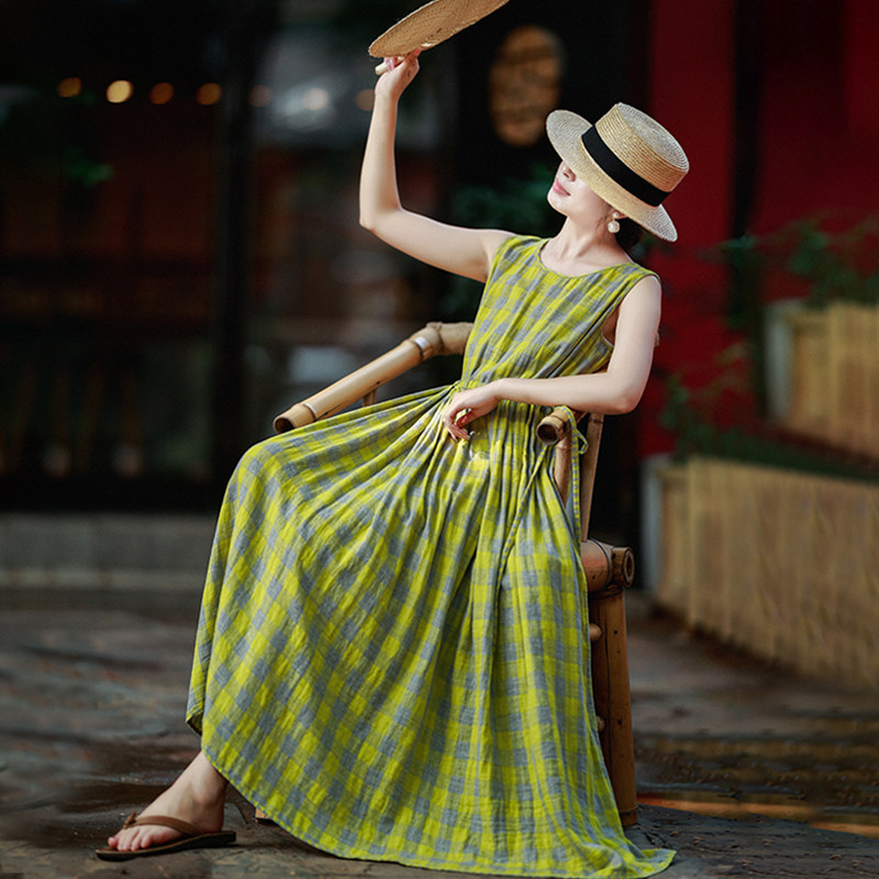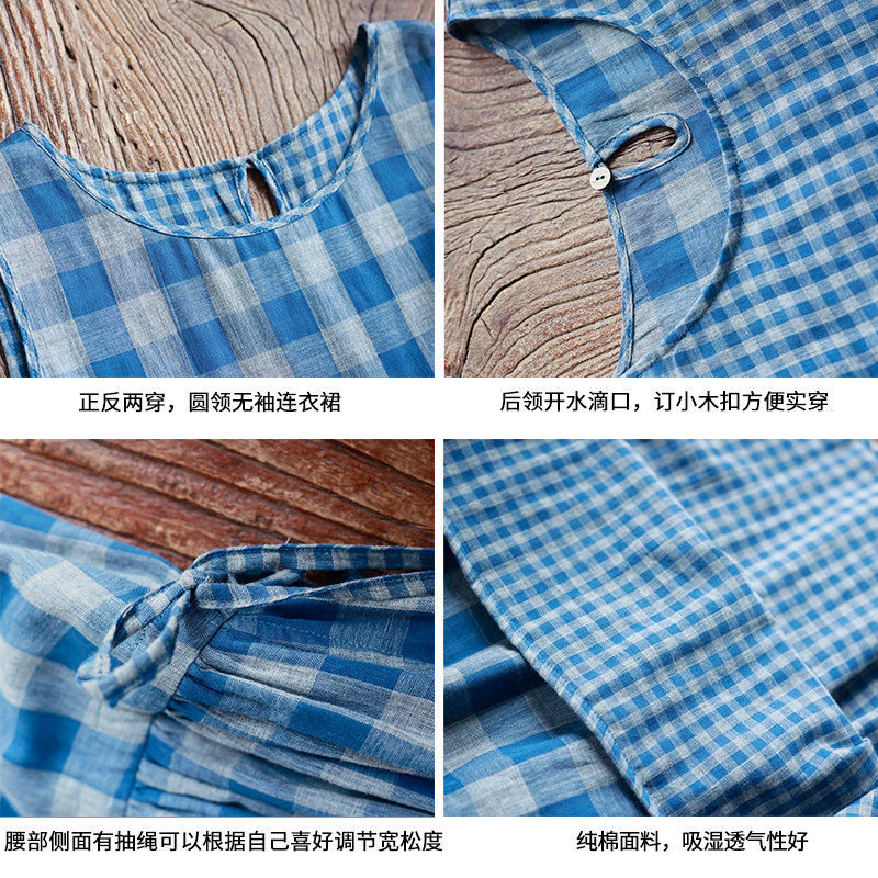 【6折】无袖连衣裙女夏季新款圆领方格子长裙设计感小众正反两穿