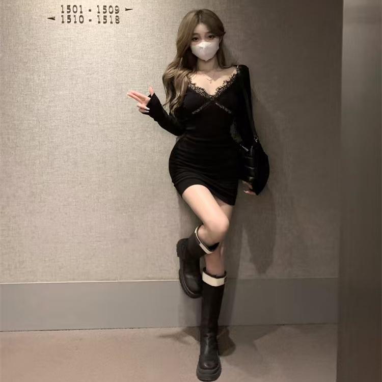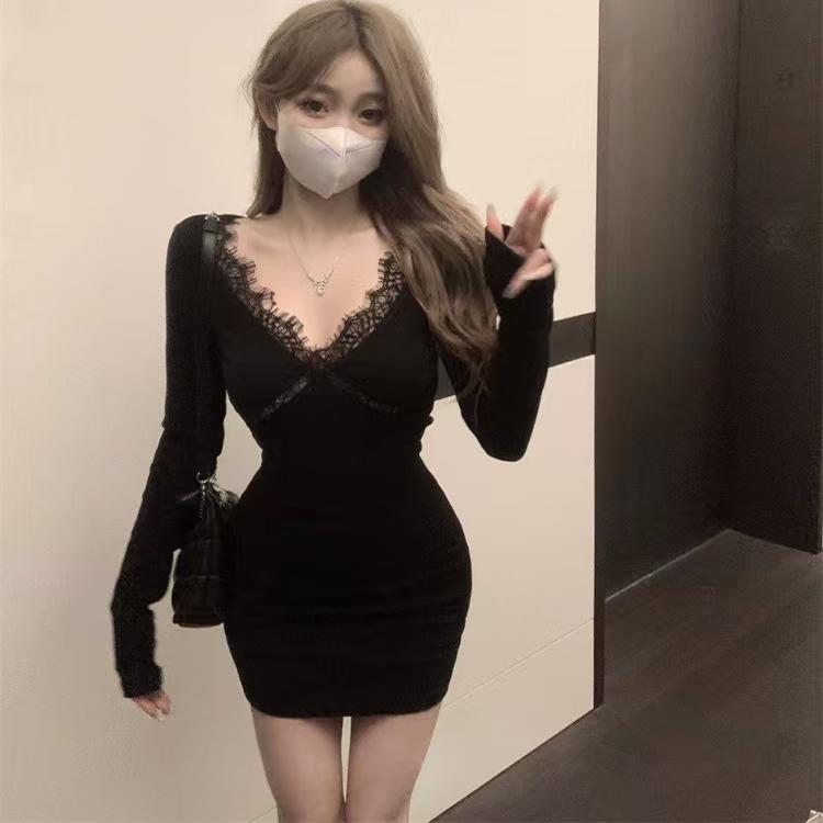 纯欲蕾丝边拼接V领连衣裙女秋季新款气质收腰修身性感包臀短裙子