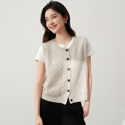 思诺芙德圆领绞花100%山羊绒马甲开衫女菱格无袖针织背心26春季