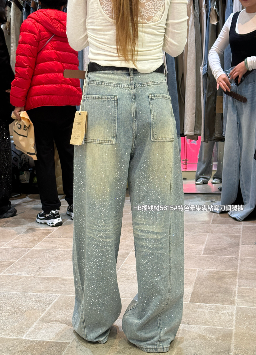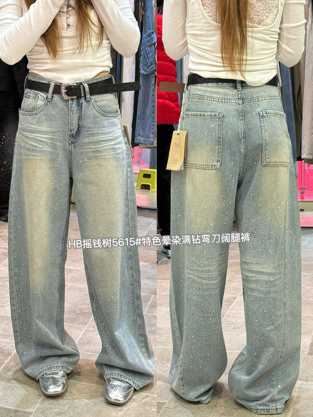 5615春季韩版气质百搭高腰显瘦特色晕染重工烫钻弯刀阔腿裤牛仔裤