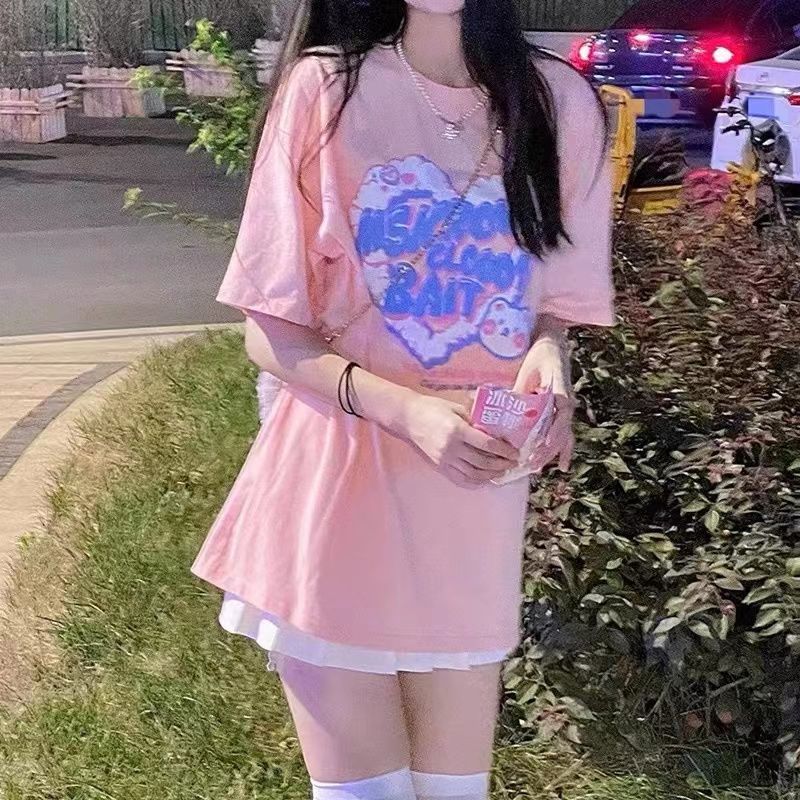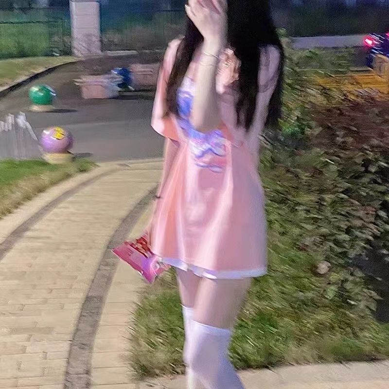 甜辣风盐系炸街少女穿搭粉色正肩短袖T恤+百褶裙两件套时尚套装裙